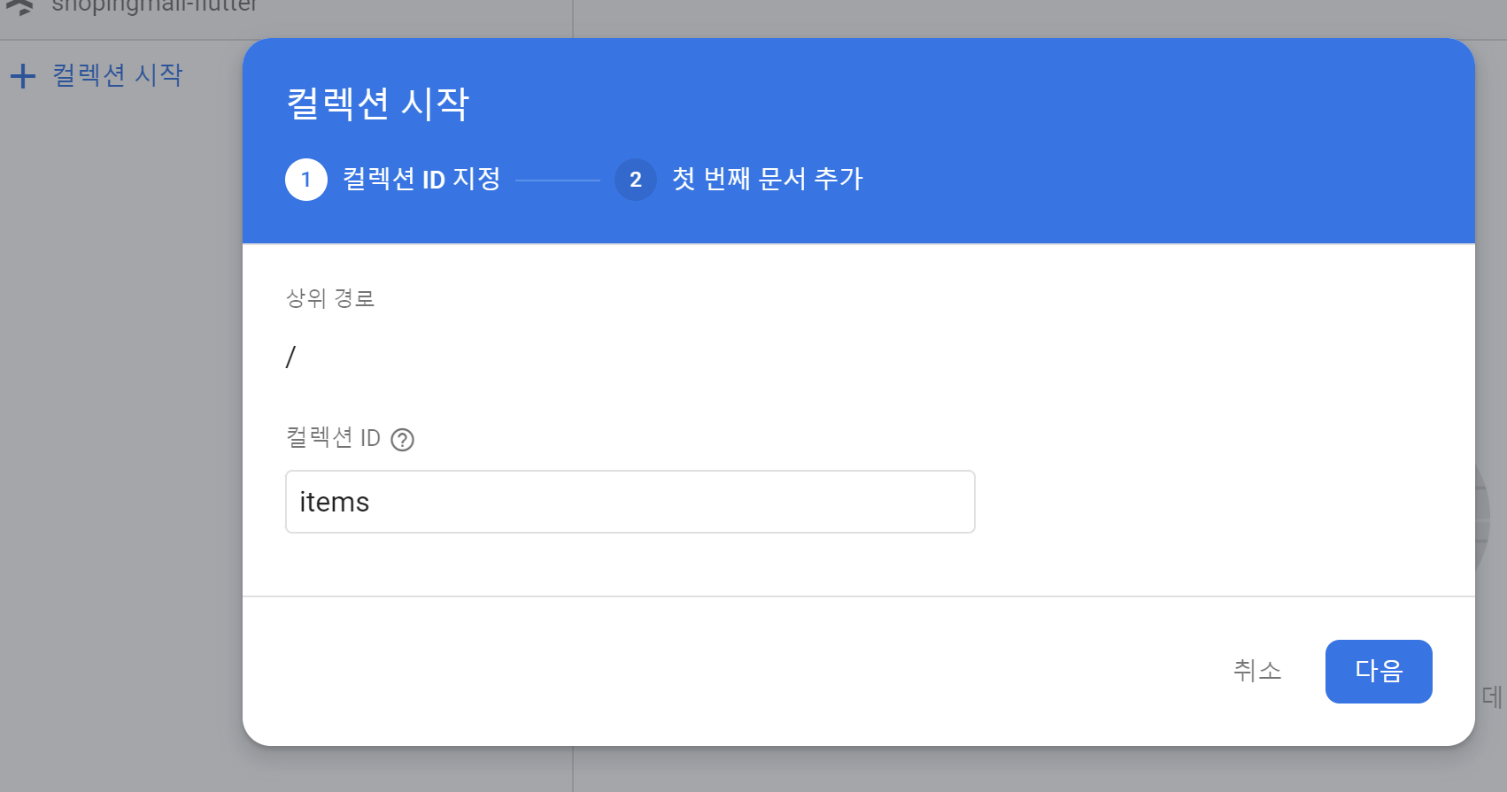 파이어 스토어에 들어가면 위처럼 빈 화면이 나오게 됩니다. 여기에 컬렉션 시작을 눌러서 데이터를 정의할 수 있습니다. 컬렉션 시작을 누르고 컬렉션 ID를 items라고 적습니다.