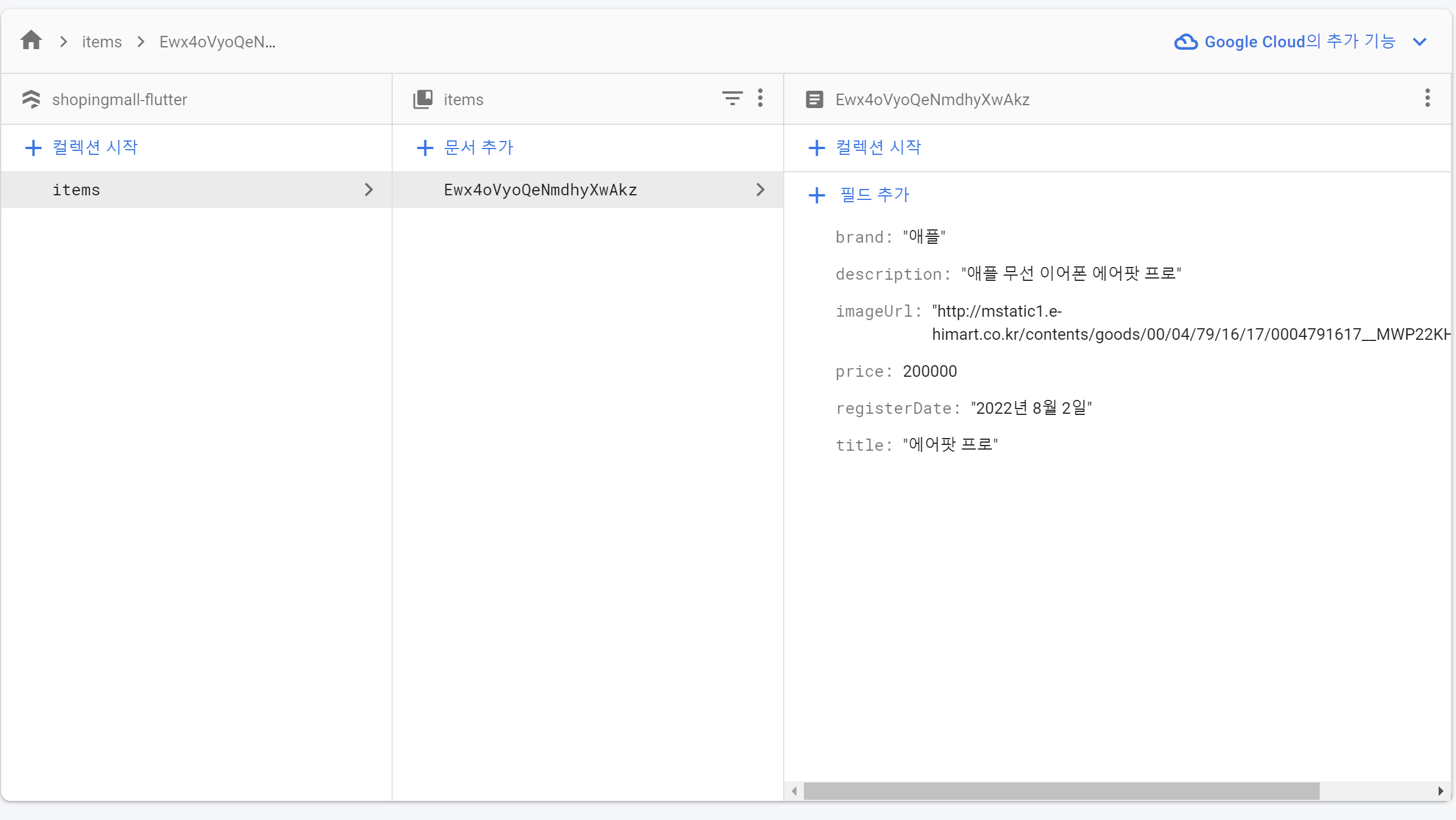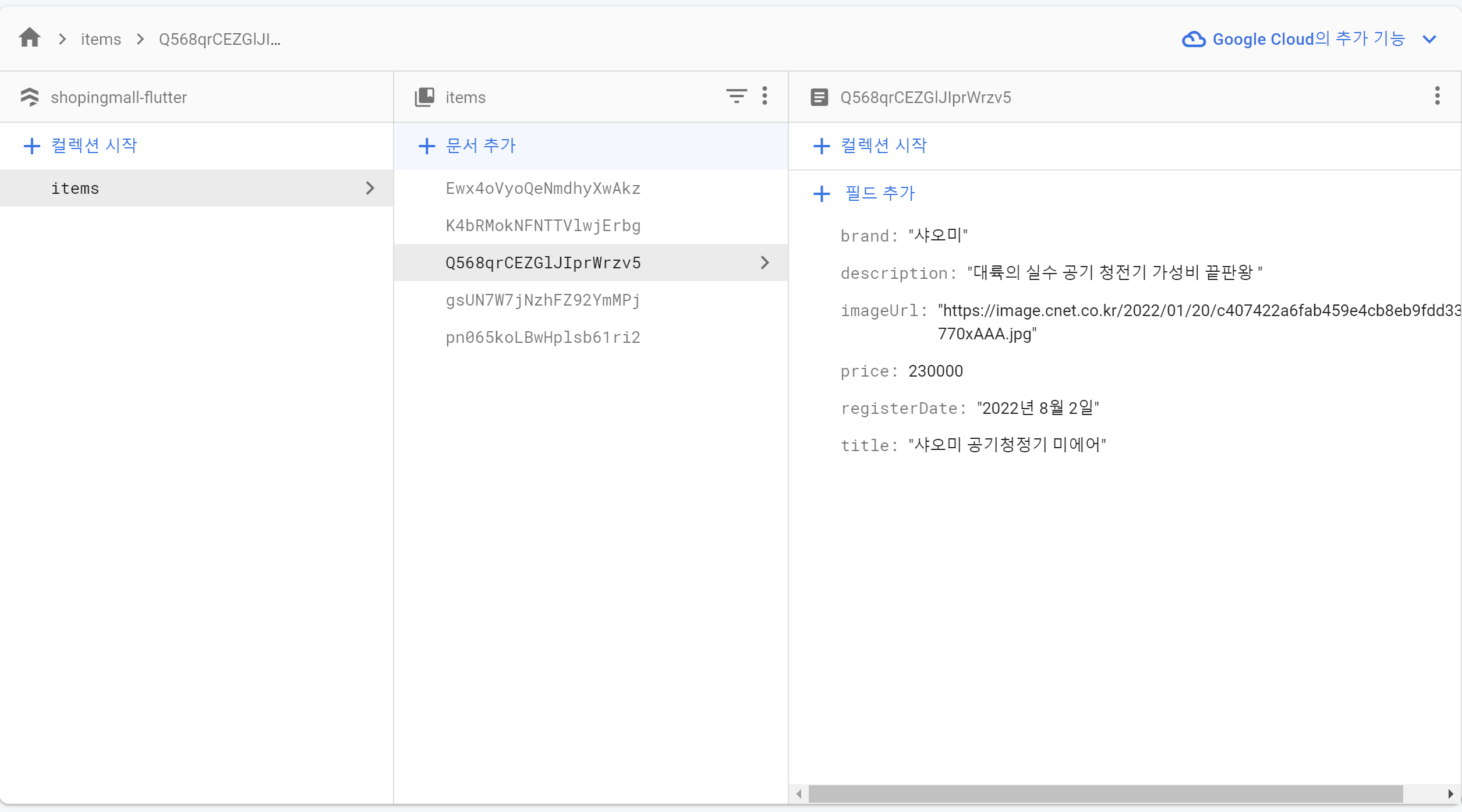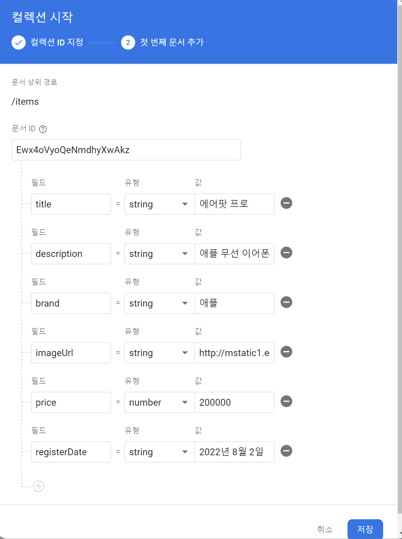 문서 ID는 자동 ID를 선택하면 알아서 만들어집니다. 그 아래 우리가 사용할 필드들을 정의하고 실제 값을 넣어서 데이터를 만듭니다. 파이어 스토어는 NoSQL이기 때문에 일반적으로 우리가 알고 있는 mysql과 같은 RDB와는 쪼꼼 다릅니다. 사용하는 필드는 title, brand, description, imageUrl, price, registerDate입니다. 필드 이름만 봐도 어떤 값인지 아시겠죠?