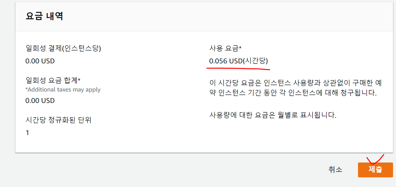 이렇게 다 선택하면 아래 사용요금이 어떻게 찍히는지 계산되어서 나옵니다. 제출을 누르게 되면 예약 인스턴스가 할당되는데요, 여기서 할당된다고 해서 바로 사용되는 건 아닙니다. 출하고 다시 밖에 화면으로 나오면 예약 인스턴스가 하나 생기긴 하는데 상태가 payment-pending입니다.