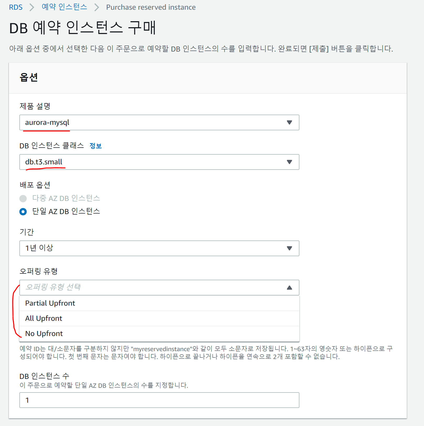 그럼 뭔가 조건을 넣는 화면이 나오는데, 내가 사용 중인 인스턴스에 정보를 넣으면 됩니다. 저는 aurora-mysql, t3.small 인스턴스를 사용하고 있습니다. 아래 배포 옵션은 만약 다중 AZ를 사용하고 있다면 체크하면 되고요. 기간은 1년~3년 이상을 선택할 수 있습니다. 그리고 중요한 게 오퍼링 유형이란 게 있는데, 3가지 유형이 있습니다.