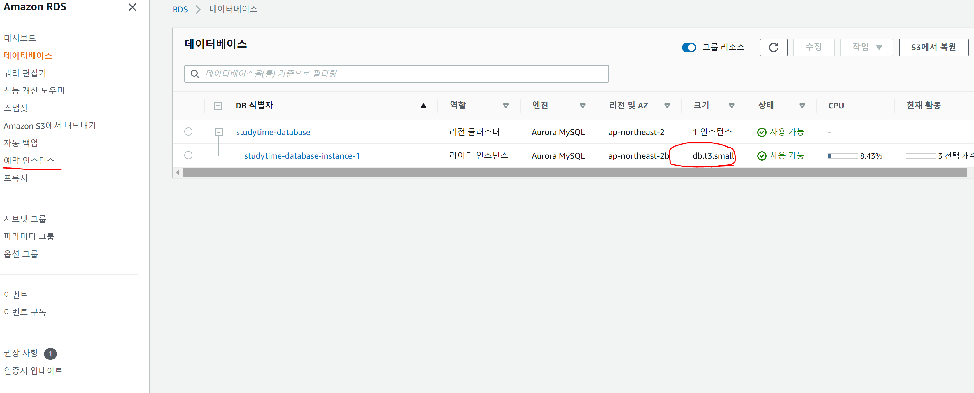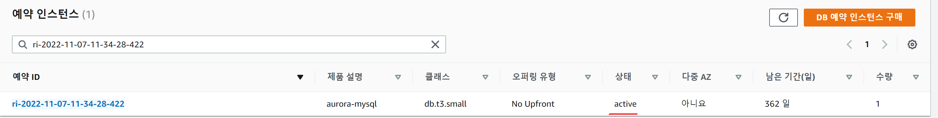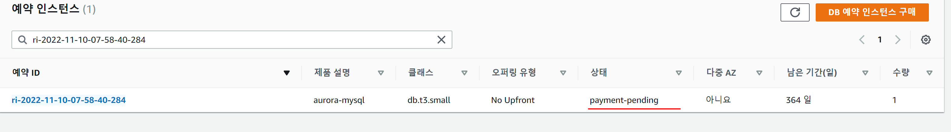 예약 인스턴스의 실행 조건은 처음 인스턴스를 생성할 때 예약 인스턴스를 걸고 생성하는 방법이 있고, 기존에 실행 중인 인스턴스를 예약 인스턴스로 변경하려면 그냥 조건만 맞게 구매하시면 됩니다. 제가 아까 사용하는 RDS가 aurora mysql에 t3.small이었기 때문에 가만히 있으면 얘가 알아서 적용해줍니다. (시간이 좀 걸립니다.)