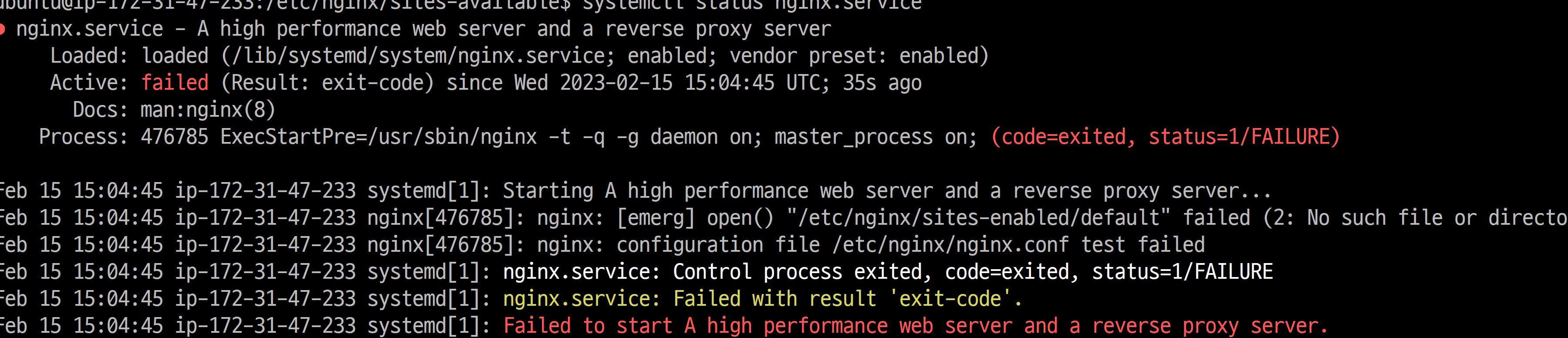 에러 메시지에 찍힌 것처럼 systemctl status nginx.service를 해봅시다.