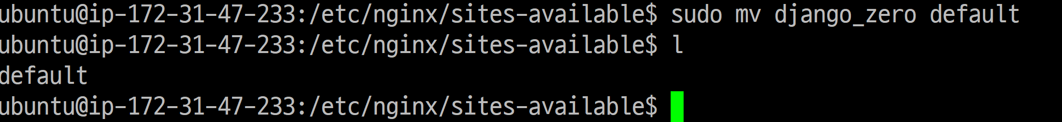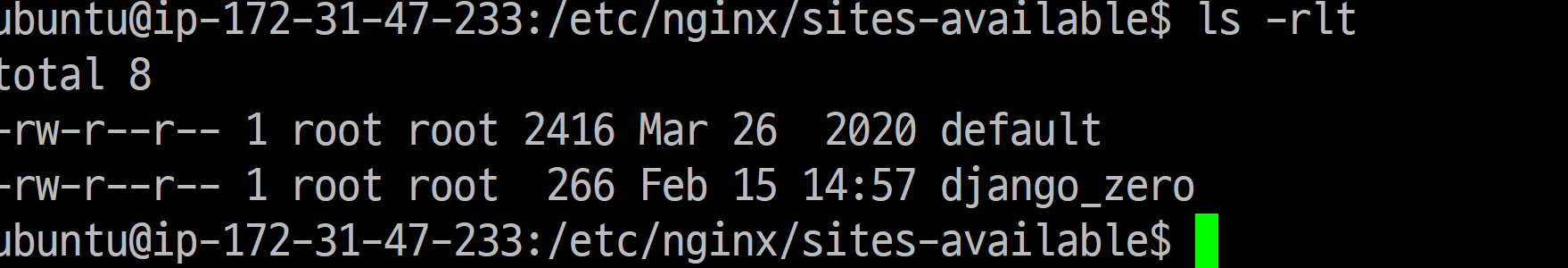 일단 nginx가 default를 잊지 못하는 것 같으니 우리가 만든 django_zero를 default라고 바꿔줍니다.