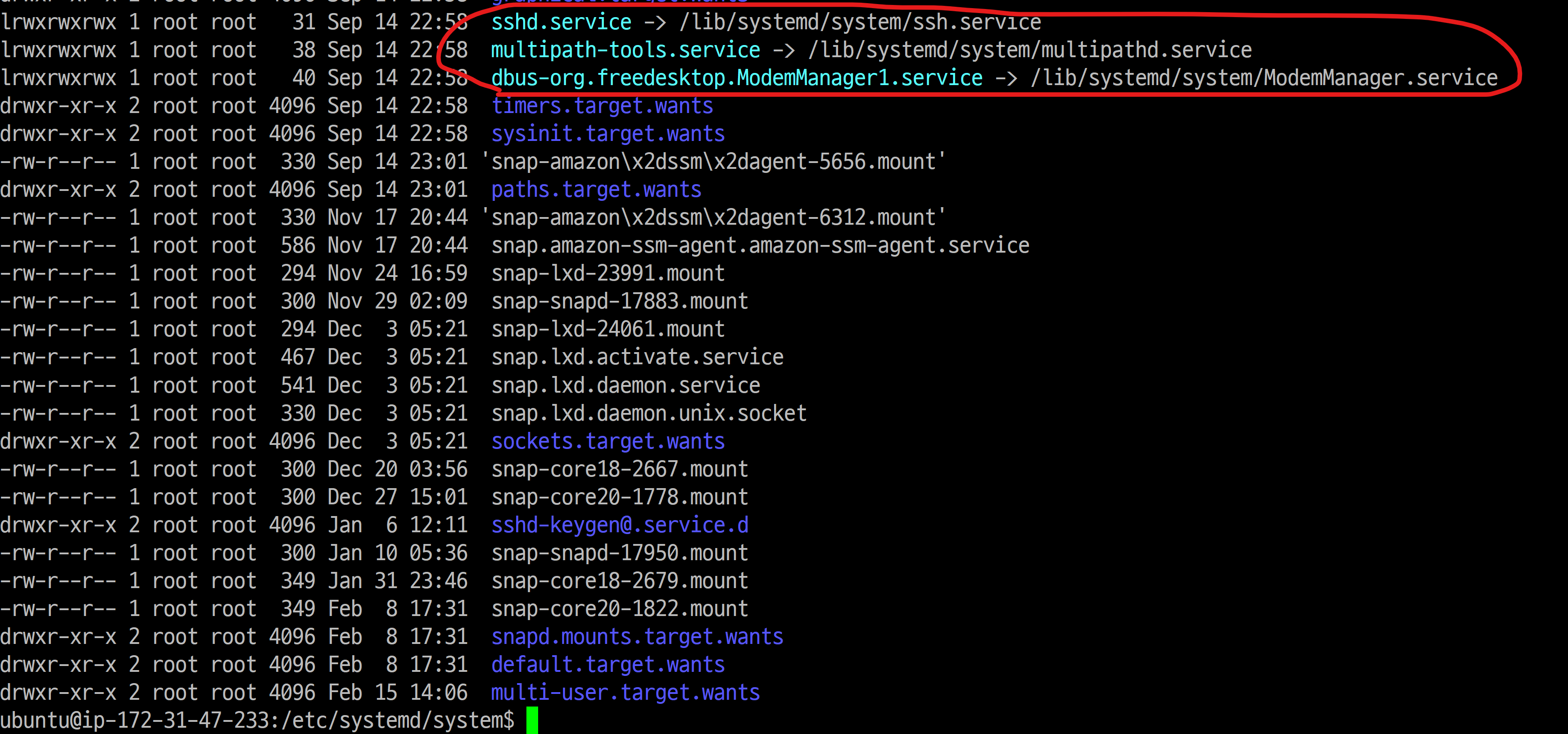 해당 경로에 가면 마찬가지로 *.service파일이 몇 개 보이는데 자세히 보면 심볼릭 링크로 걸려있습니다.