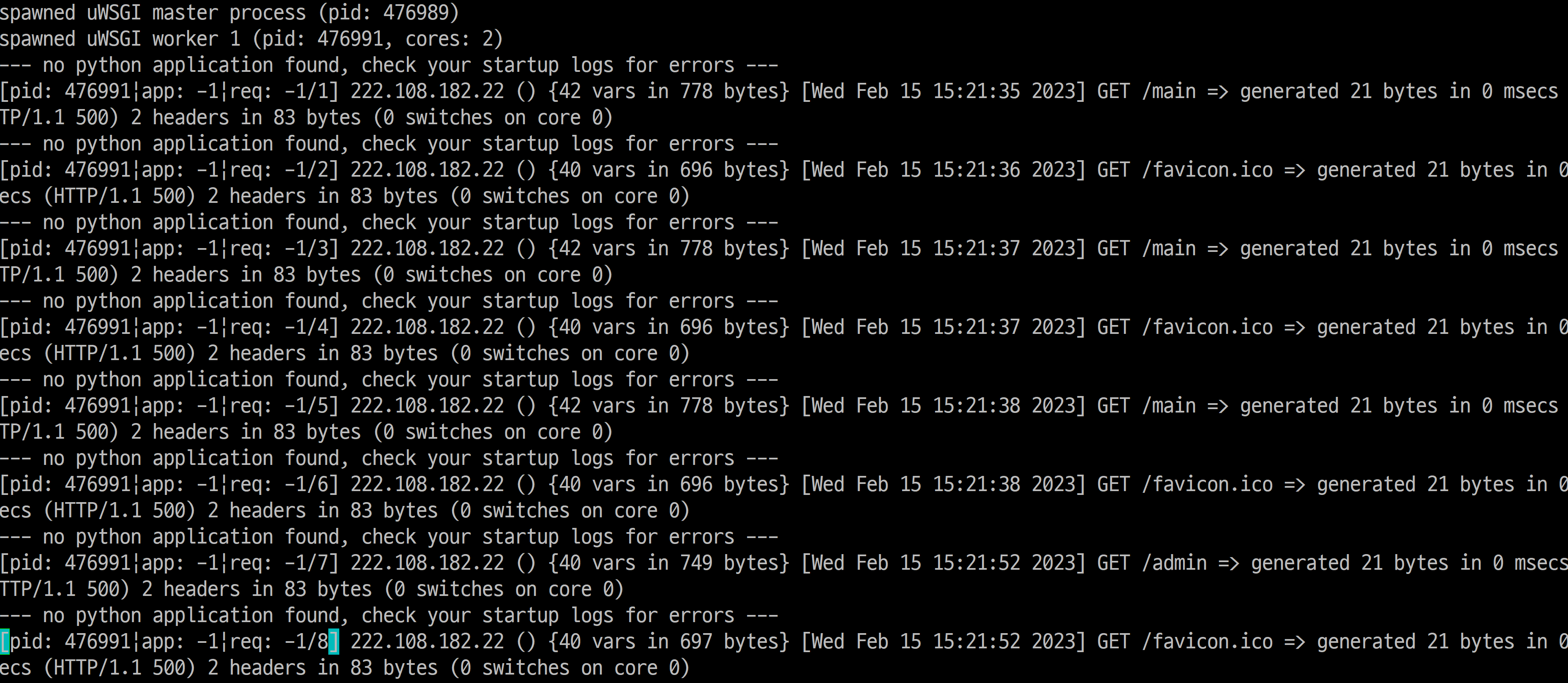 500 에러가 찍히긴 했네요. 흠 근데 왜 발생한 건지는 모르겠네요. uwsgi 쪽으로 통신을 못한 것 같기도 하고요.