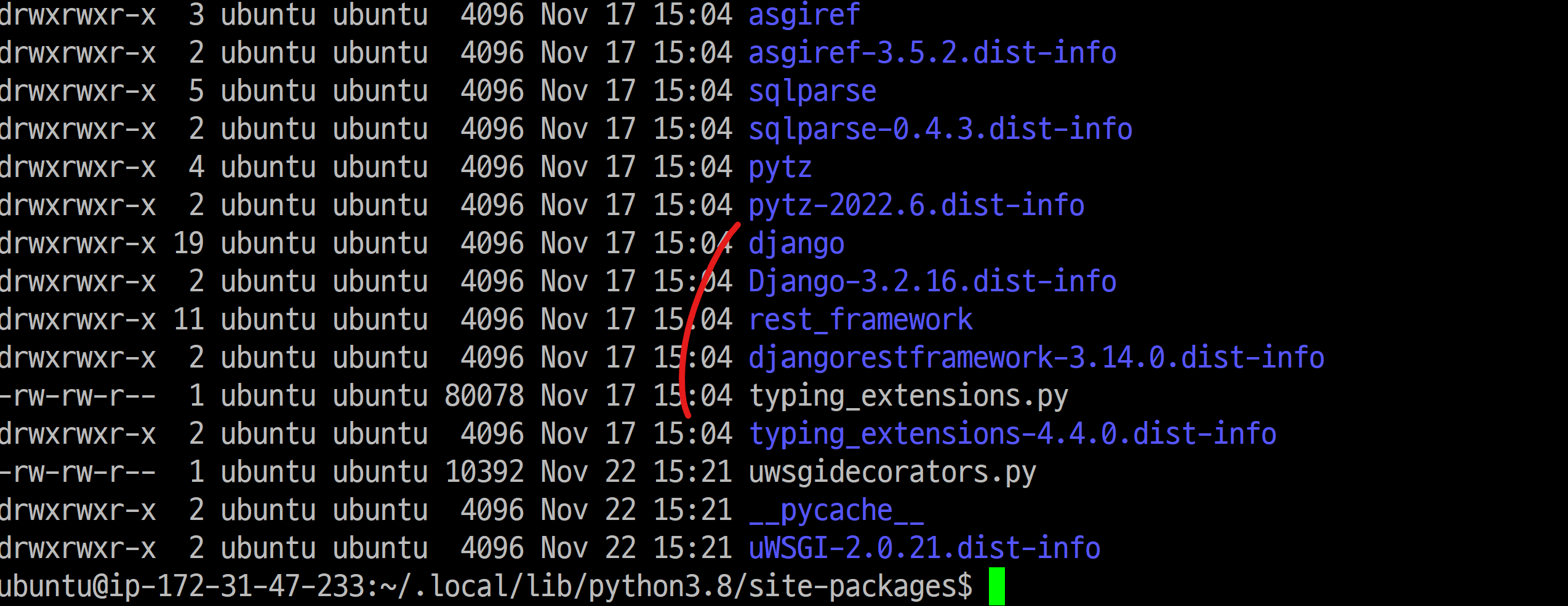 저는 /home/ubuntu/.local/lib/python3.8/site-packages 요기에 설치되어 있었고, 실제로 경로에 가보니 장고가 깔려있었습니다.