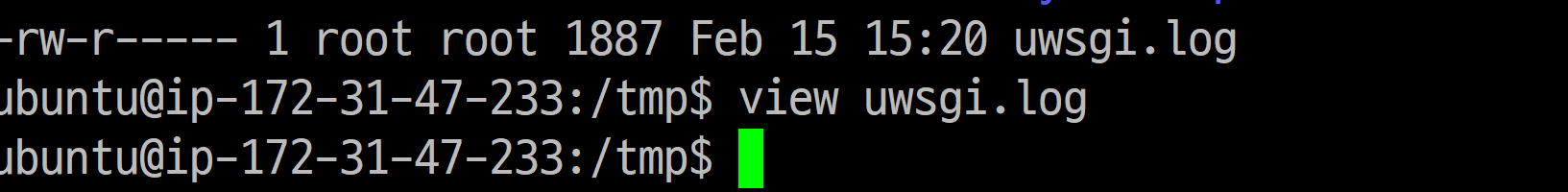 이제 로그를 열어보는데, sudo권한으로 열어야 합니다. sudo vi uwsgi.log를 해줍니다.