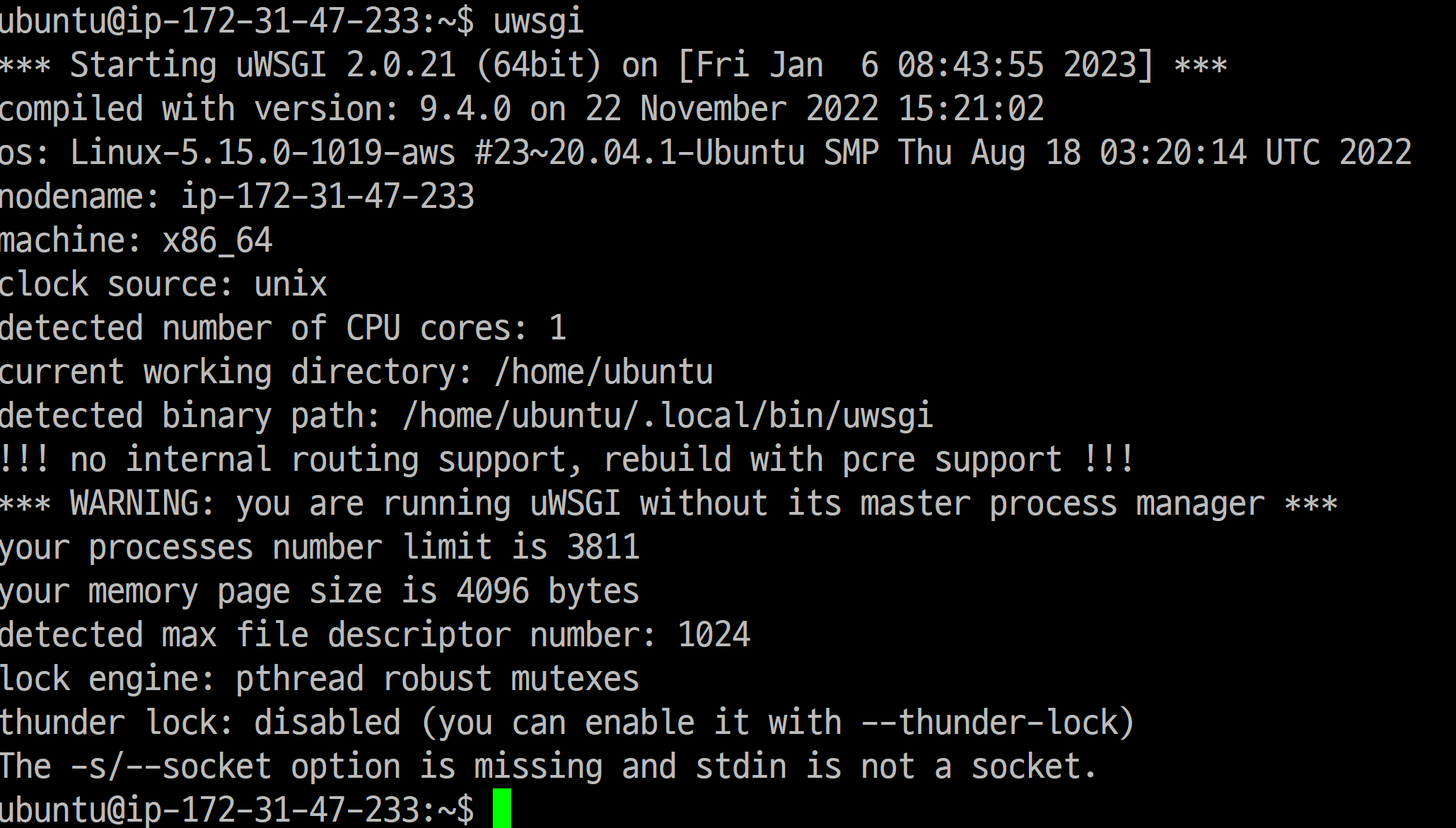 실행하면 위와 같이 어쩌구 저쩌구가 뜨면서 uwsgi가 실행됩니다. 이전에는 브라우저에서 접속해서 확인할 수 있었지만, 이번엔 소켓으로 실행했기 때문에 외부에서 실행할 수가 없습니다 ㅎㅎ