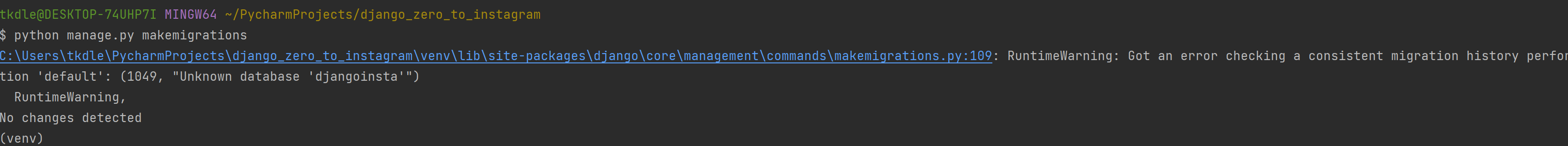 이름만 바뀌고 같은 에러가 나오는군요. 이건 실제로 djangoinsta라는 db가 없기 때문입니다. 장고는 기본적으로 ORM을 지원하고, ORM이란 모델 = 테이블 이 자동으로 매핑된다는 의미입니다. 이 기능을 활용하기 위해 필요한 것이 바로 migration인데요, 저희가 장고를 사용하면서 모델을 변경할 때마다 해주던 migrate를 해주어야 DB가 생기게 됩니다. 기존에 sqlite3은 우리가 제일 처음 migrate를 해주었기 때문에 사용할 수 있었고, mysql 역시 migrate를 해주어야 사용할 수 있습니다.