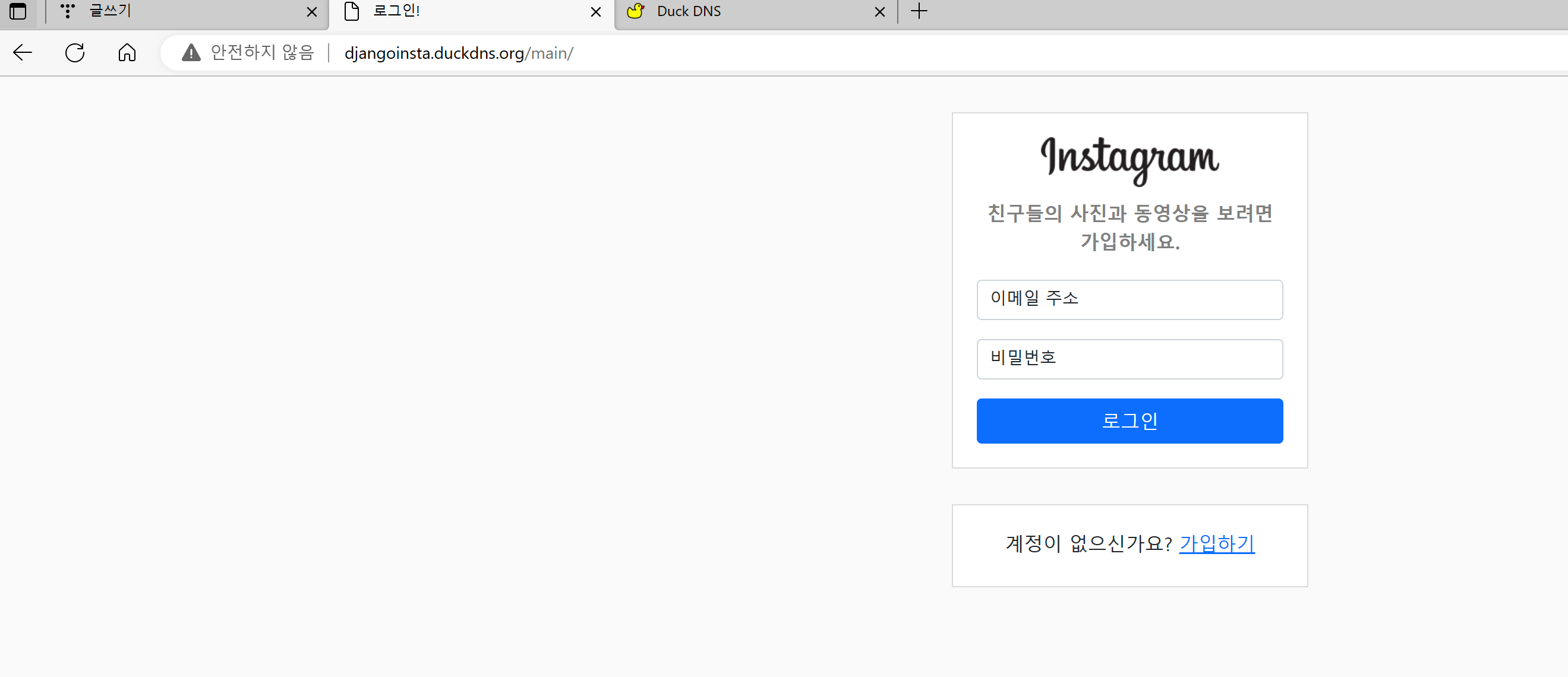 위 사이트에 접속해서 구글로 로그인하고, 원하는 도메인 이름 선택하면 xxx.duckdns.org로 접속이 가능합니다. 저는 djangoinsta.duckdns.org로 만든 다음 제 ec2에 ip주소를 넣어주었습니다.