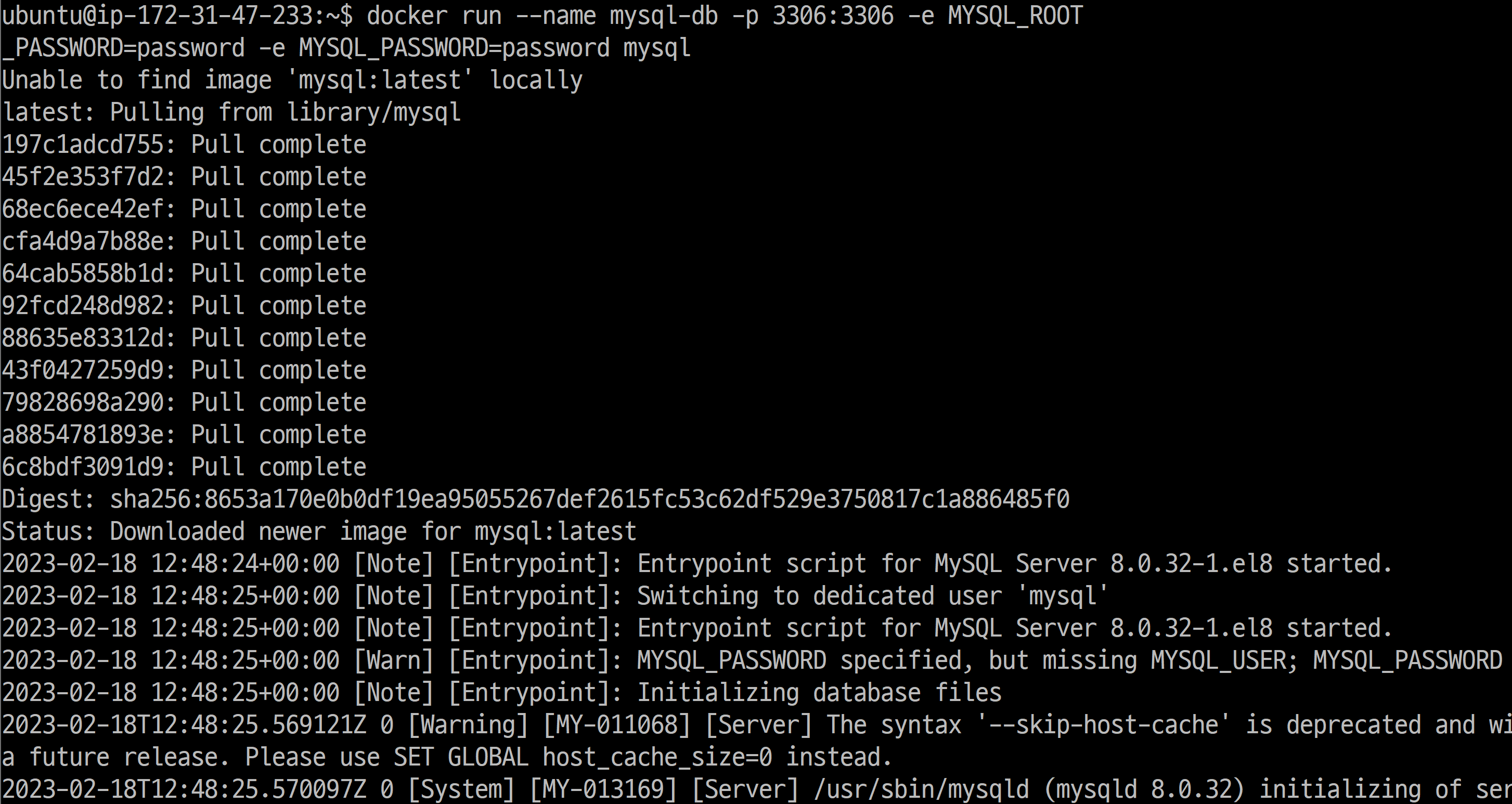 docker run --name mysql-db -p 3306:3306 -e MYSQL_ROOT_PASSWORD=password -e MYSQL_PASSWORD=password mysql