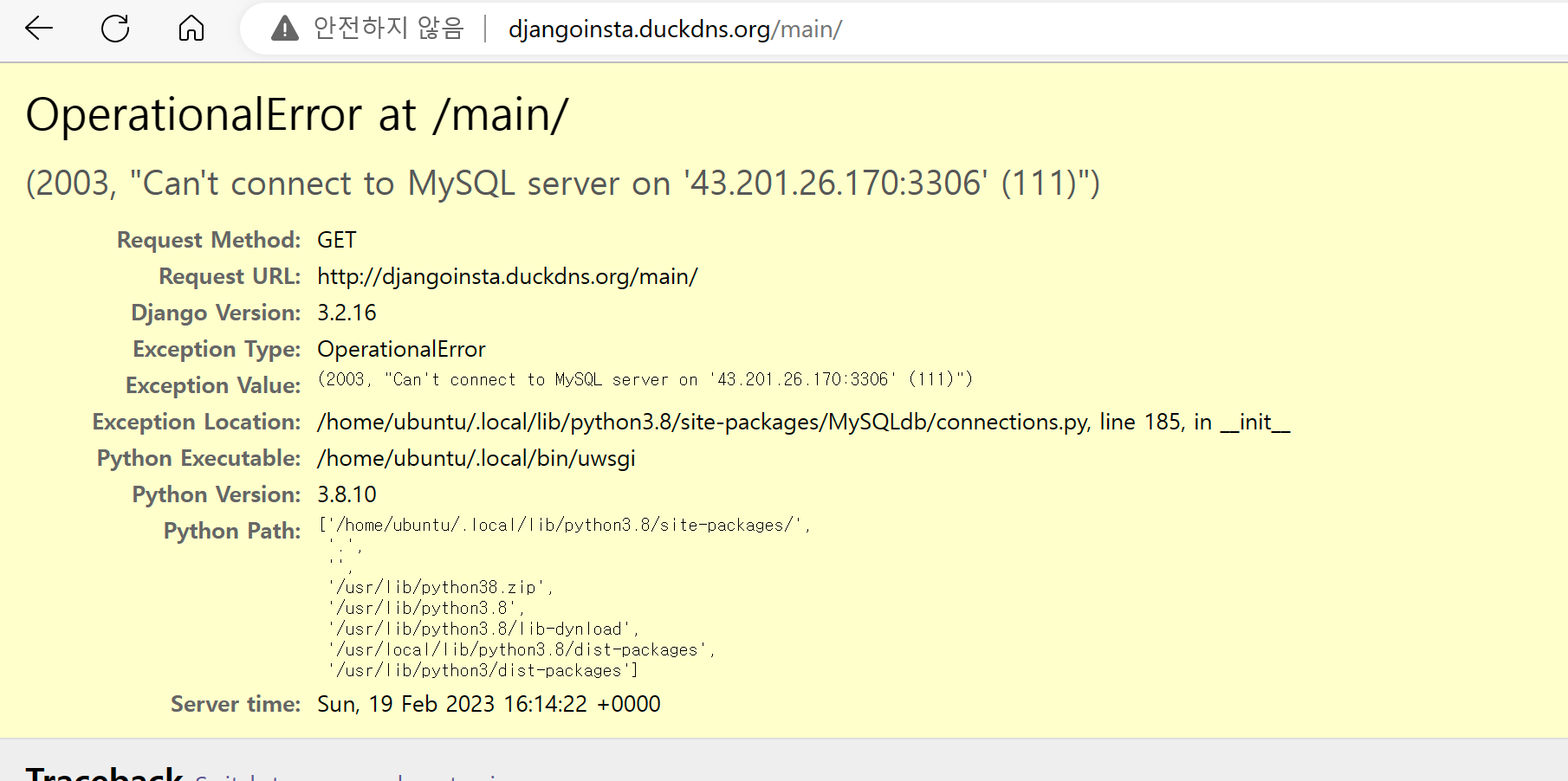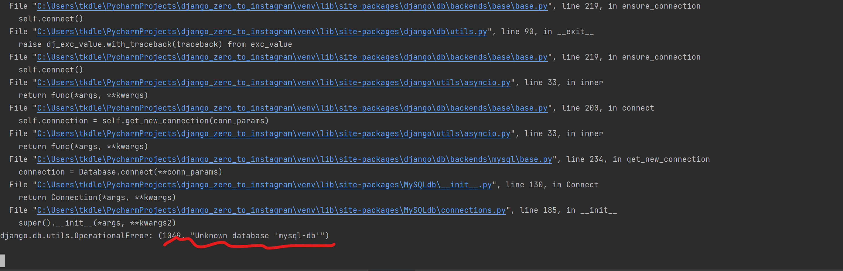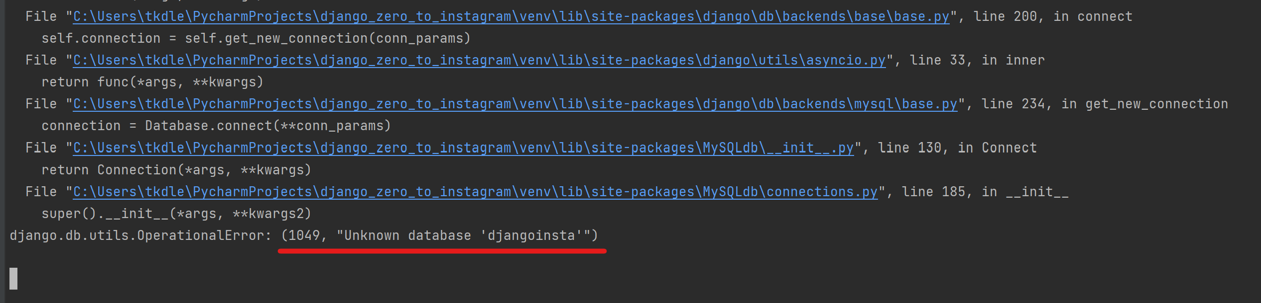 역시 Unknown databse가 나오는데요, 이건 저희가 mysql로 db를 띄웠지만, 거기서 djangoinsta라는 db를 생성하지 않아서 그렇습니다. 가장 초기에 database를 생성하는 건 사용자가 해주어야 합니다.