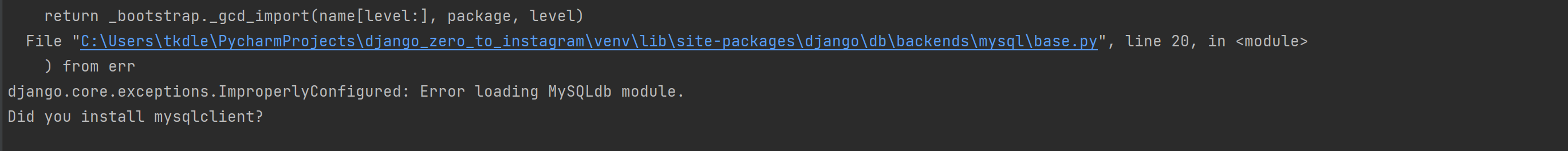 그냥 실행하면 did you install mysqlclient?라는 에러를 볼 수 있습니다. 이건 저희 프로젝트에서 mysql을 사용할 준비가 안되었다는 건데요, mysql을 사용하려면 mysql 지원 패키지를 설치해야 합니다. 설치는 간단합니다. pip install mysqlclient 하면 됩니다.