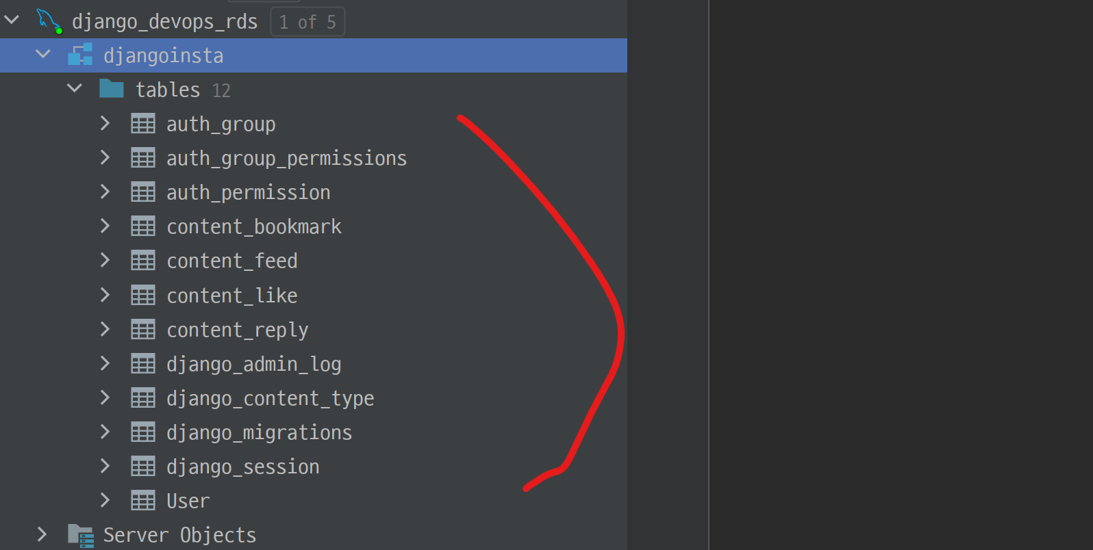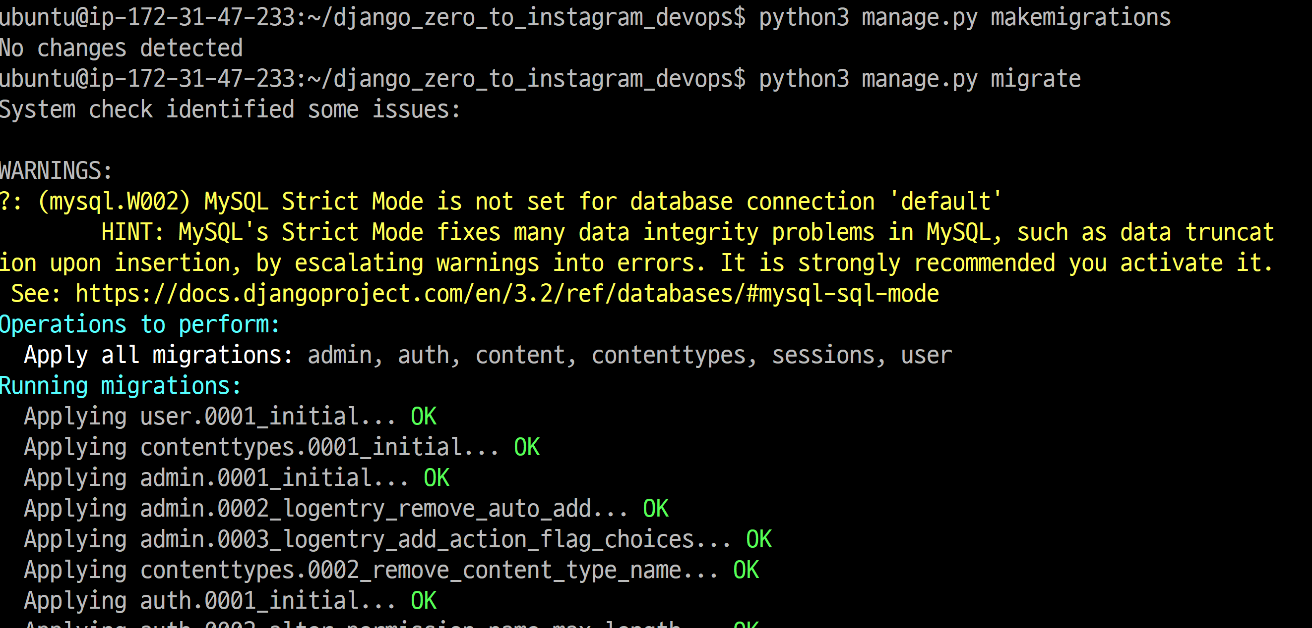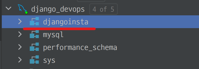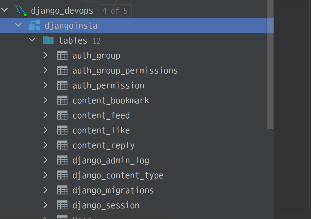 생성을 하면 그림처럼 djangoinsta 항목이 생기게 됩니다. 이게 django_devops라는 mysql서버에 있는 database가 생긴 겁니다. 다시 migrate를 하면 이제 에러가 안나는 것을 확인할 수 있습니다.