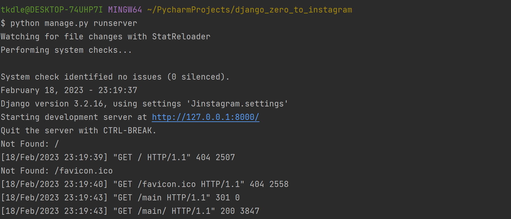 name을 djangoinsta로 변경했습니다. 다시 한번 django를 실행해 볼까요?