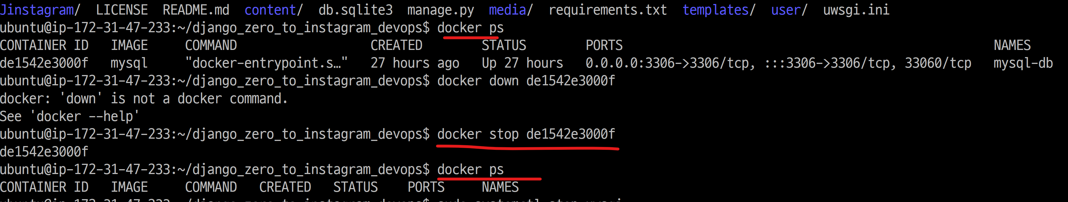 docker ps를 하면 구동 중인 도커 컨테이너 리스트가 나온다. 여기서 docker stop {container id}로 실행 중인 도커를 종료할 수 있다. down인 줄 알았는데 틀렸음.. ㅎㅎ