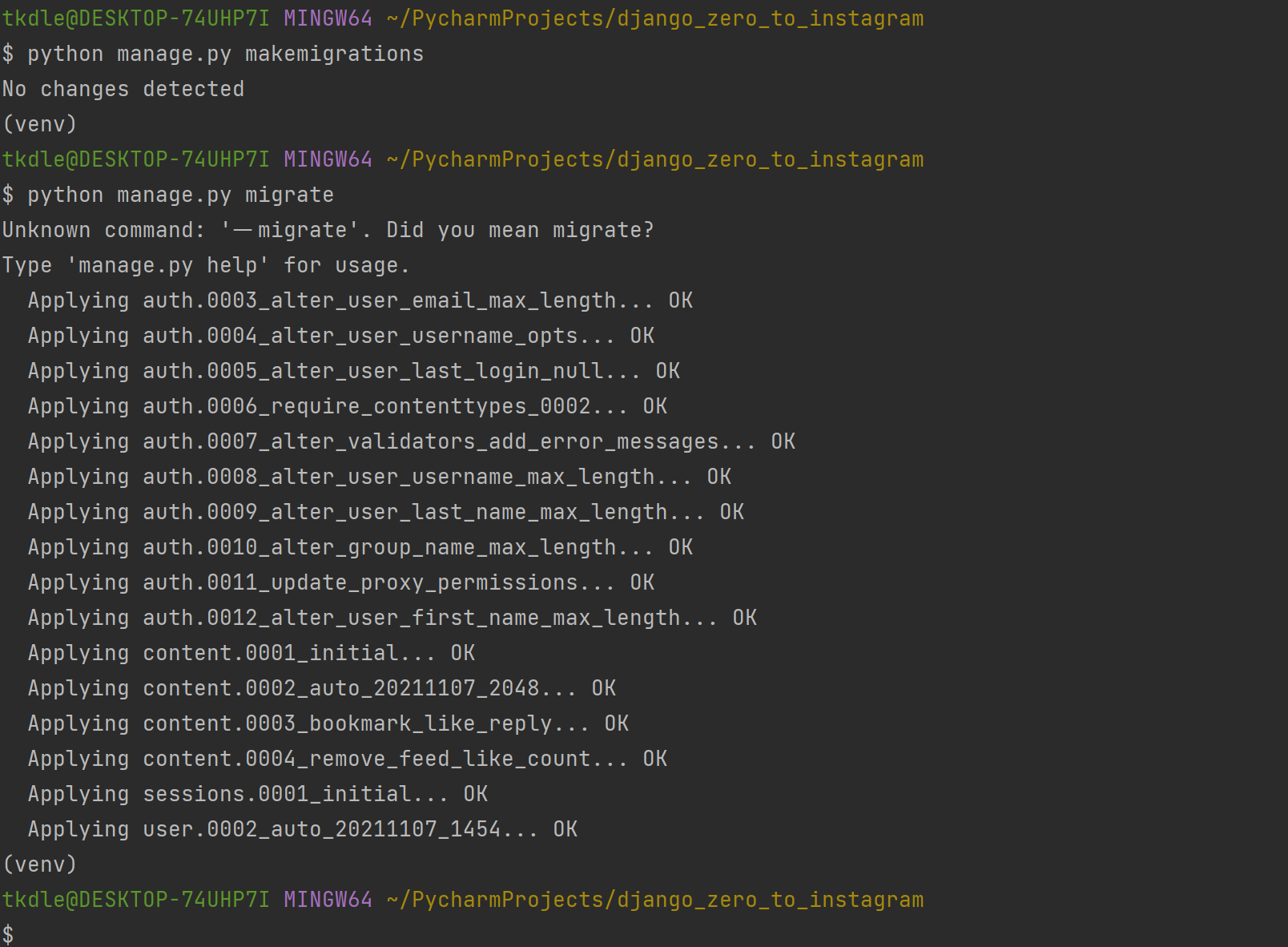 그럼 python manage.py makemigrations, python manage.py migrate를 해봅시다~!