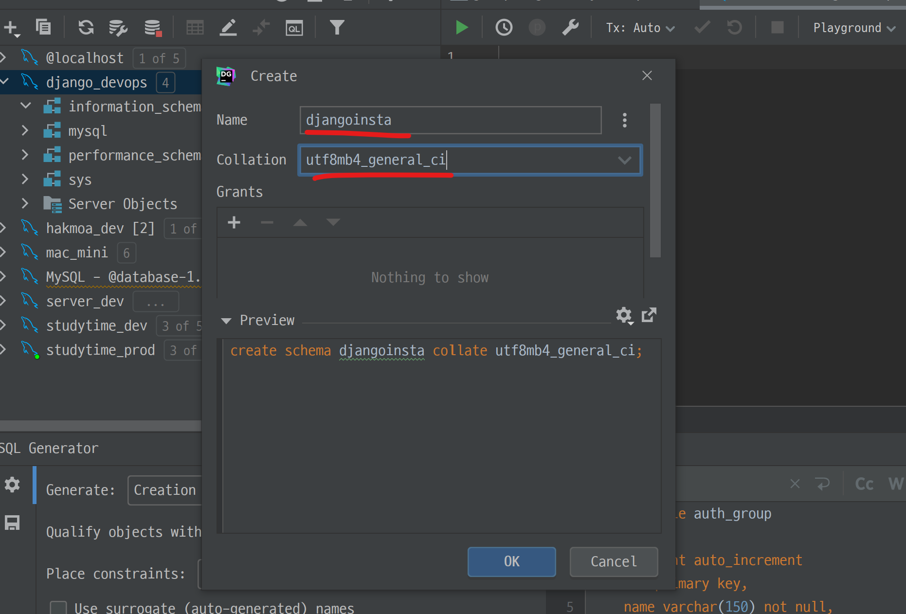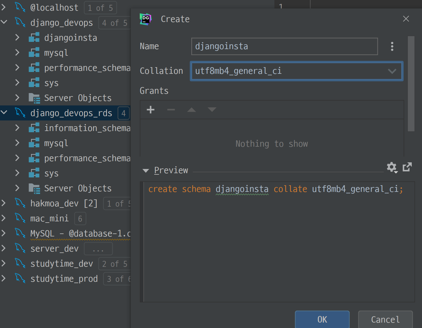 datagrip에서 create schema를 통해 우리가 띄운 mysql에 djangoinsta라는 database를 추가해 줍니다.