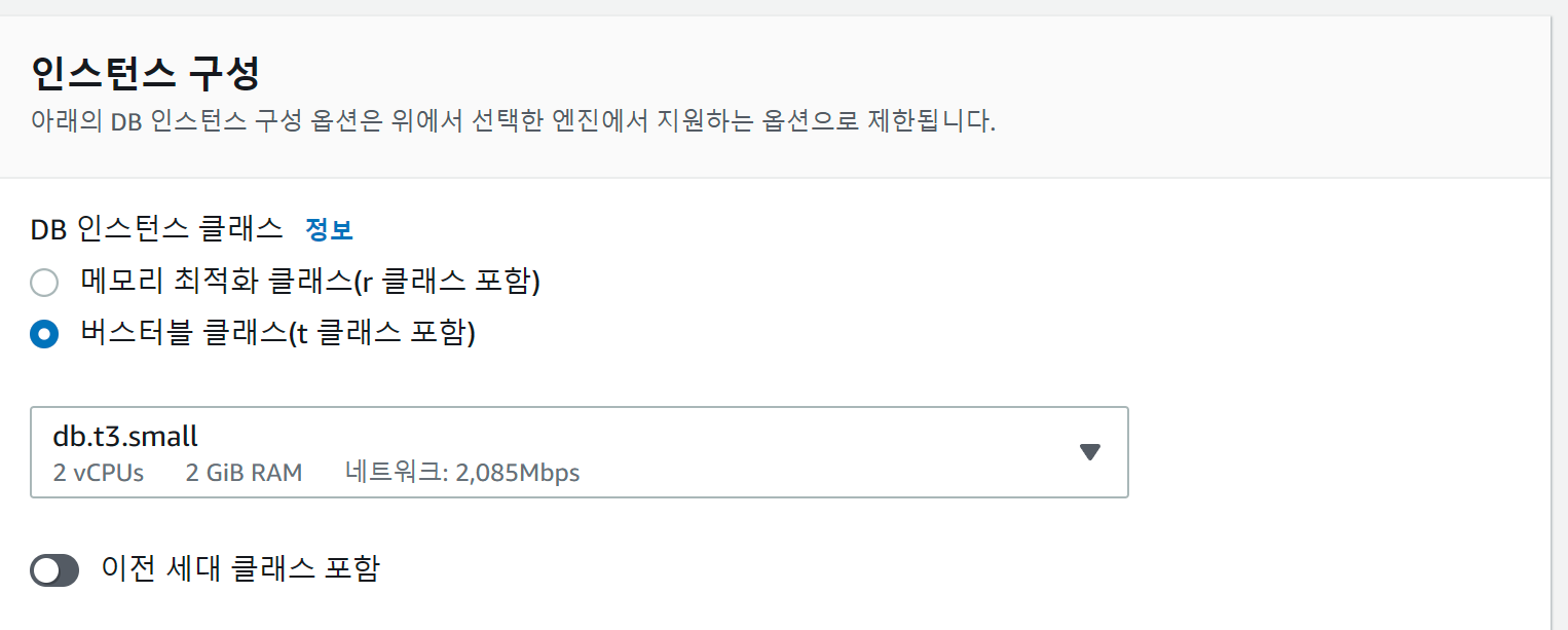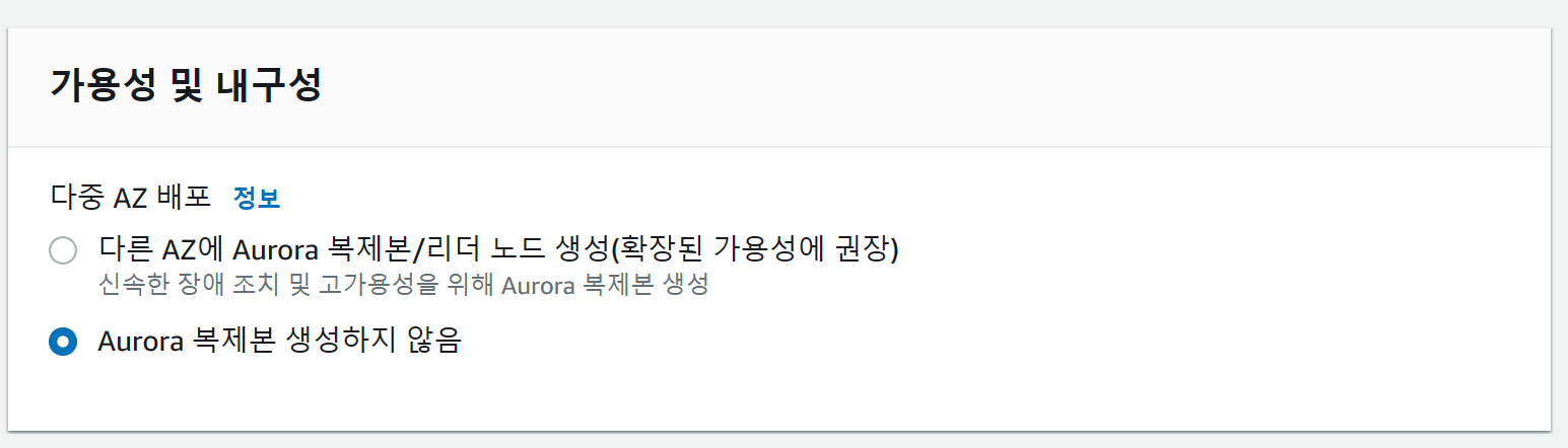 일단 가용성이란 말은 DB가 문제가 생겼을 때 정상작동을 지원하는 성능(?)이라고 생각하시면 됩니다. 가용성이 높으면 장애가 나도 서비스가 되도록 알아서 처리해 준다는 의미입니다. 여기서 다중 AZ를 선택하게 되면 DB가 여러 개 생기게 됩니다. 이렇게 여러 개를 생성하면 한쪽에서 장애 나면 다른 쪽 DB로 서비스되기 때문이죠. 나중에 서비스용으로 할 때는 가용성을 선택하는 게 좋으나, 저희는 일단 없어도 되기 때문에 아래를 선택합니다.