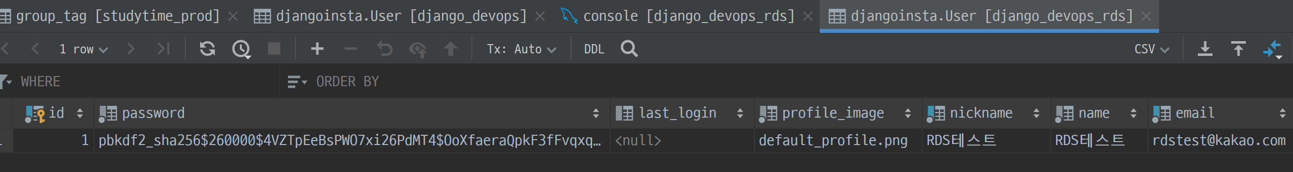 - 기본 database를 만들어준다. (djangoinsta schema생성해 준 것처럼 RDS에서도 생성해줘야 함)