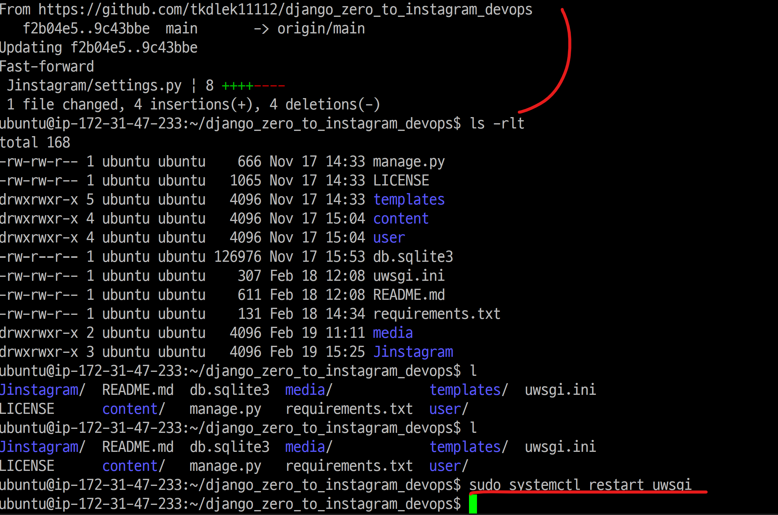 git pull로 소스를 반영하고 uwsgi를 재부팅해줍니다. 그리고 /tmp/uwsgi.log를 확인하거나 직접 브라우저로 접속해서 제대로 실행되는지 봐줍니다.