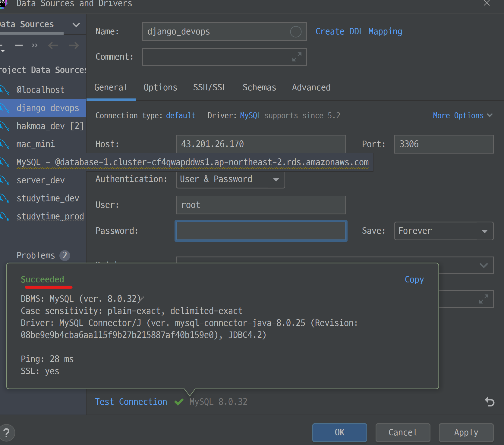 포트를 열고 다시 datagrip으로 돌아와서 접속시도를 해보면 아까는 Fail이 떨어졌는데 지금은 Success가 됩니다.