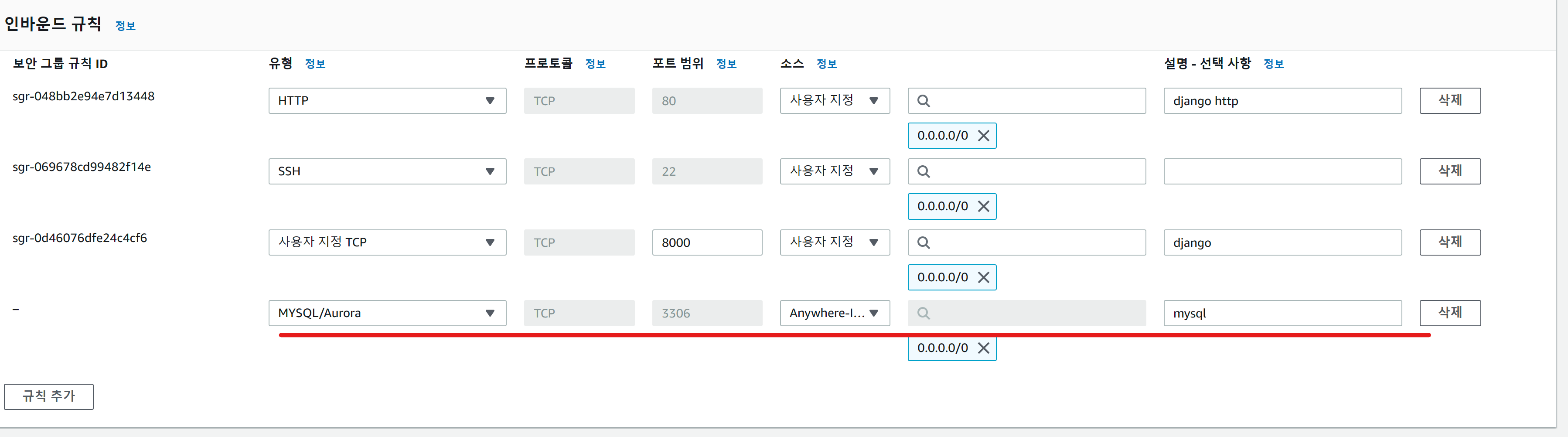 저는 기존에 RDS 사용하는 게 있어서 이것저것 추가가 많이 되어있는데, 여러분들은 3306으로 0.0.0.0/0만 있으면 될 겁니다. 이게 퍼블릭 액세스 옵션을 켜면 자동으로 생기는지 기억이 안 나네요. @_@ 만약 있다면 그냥 냅두시면 되고, 없으면 추가하시면 됩니다.