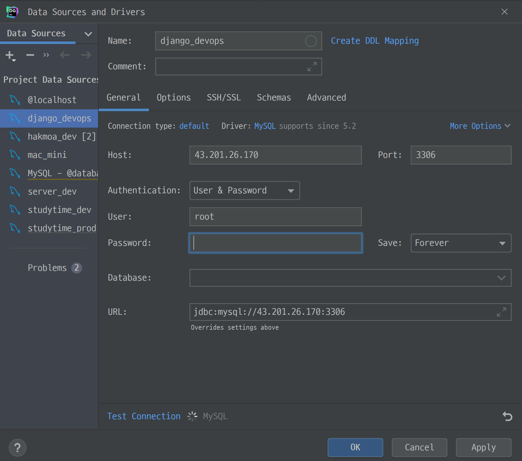 host는 우리의 EC2를 입력해 주고, port는 3306으로 지정합니다. 그러면 EC2의 3306으로 통신하게 되고, 우리가 docker를 실행할 때 3306으로 들어온 외부 통신은 docker에 있는 3306으로 포워딩하기 때문에 mysql과 통신하게 됩니다.