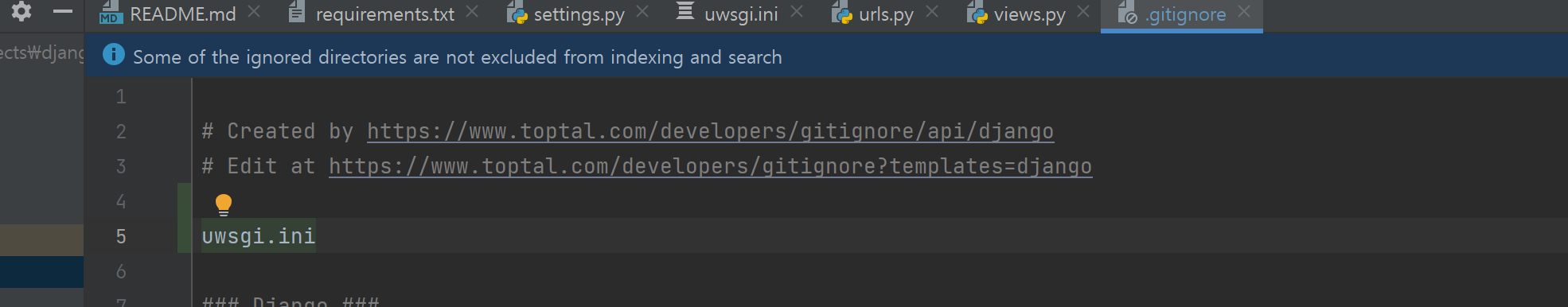 이렇게 되면 문제는 uwsgi.ini를 github에 추가해 놨었는데, ini파일은 github에서 빼야 한다는 것이다. ㅋㅋㅋ 이런 서버 설정 같은 건 코드에서 빠지는 게 맞지...