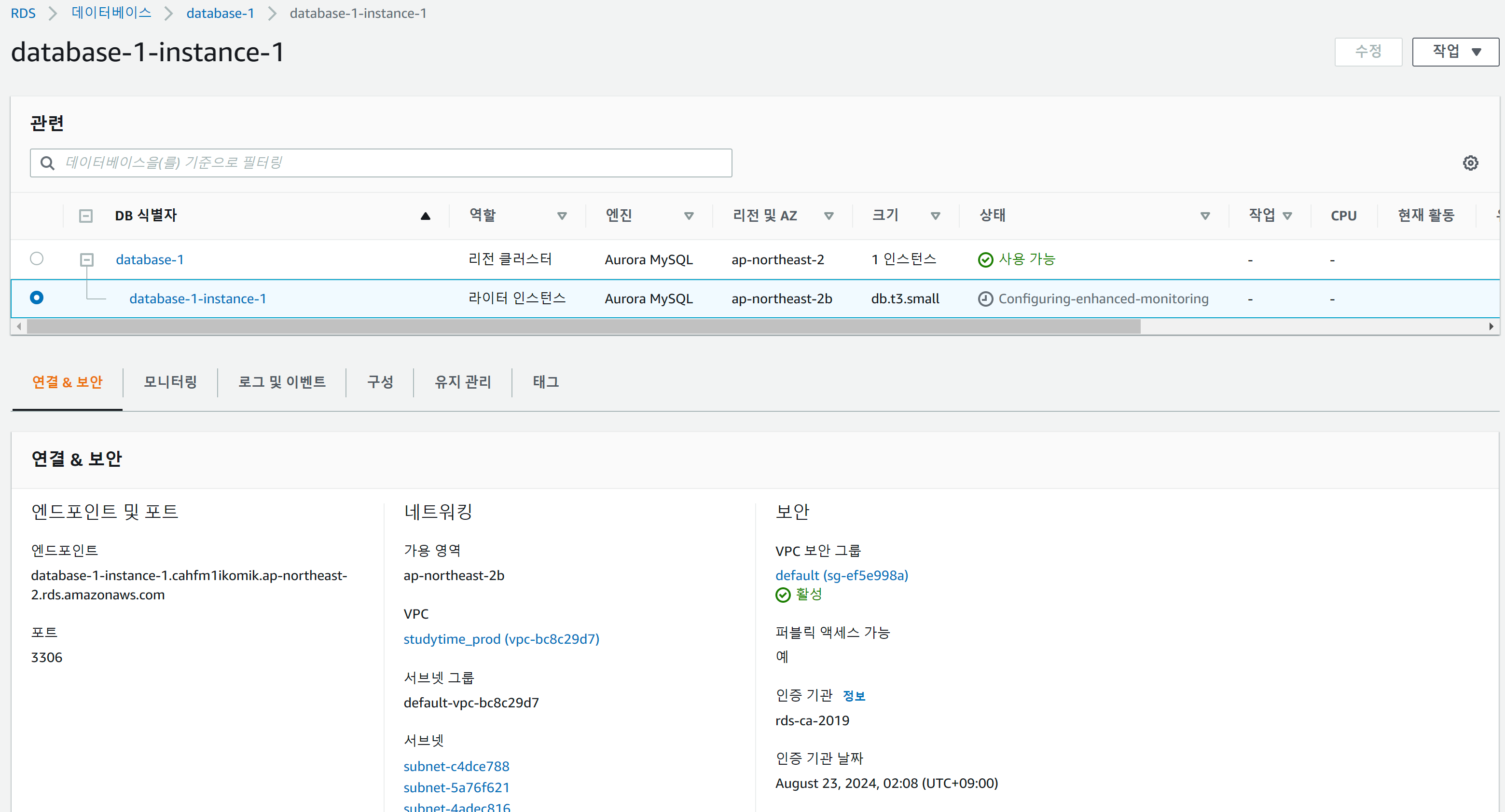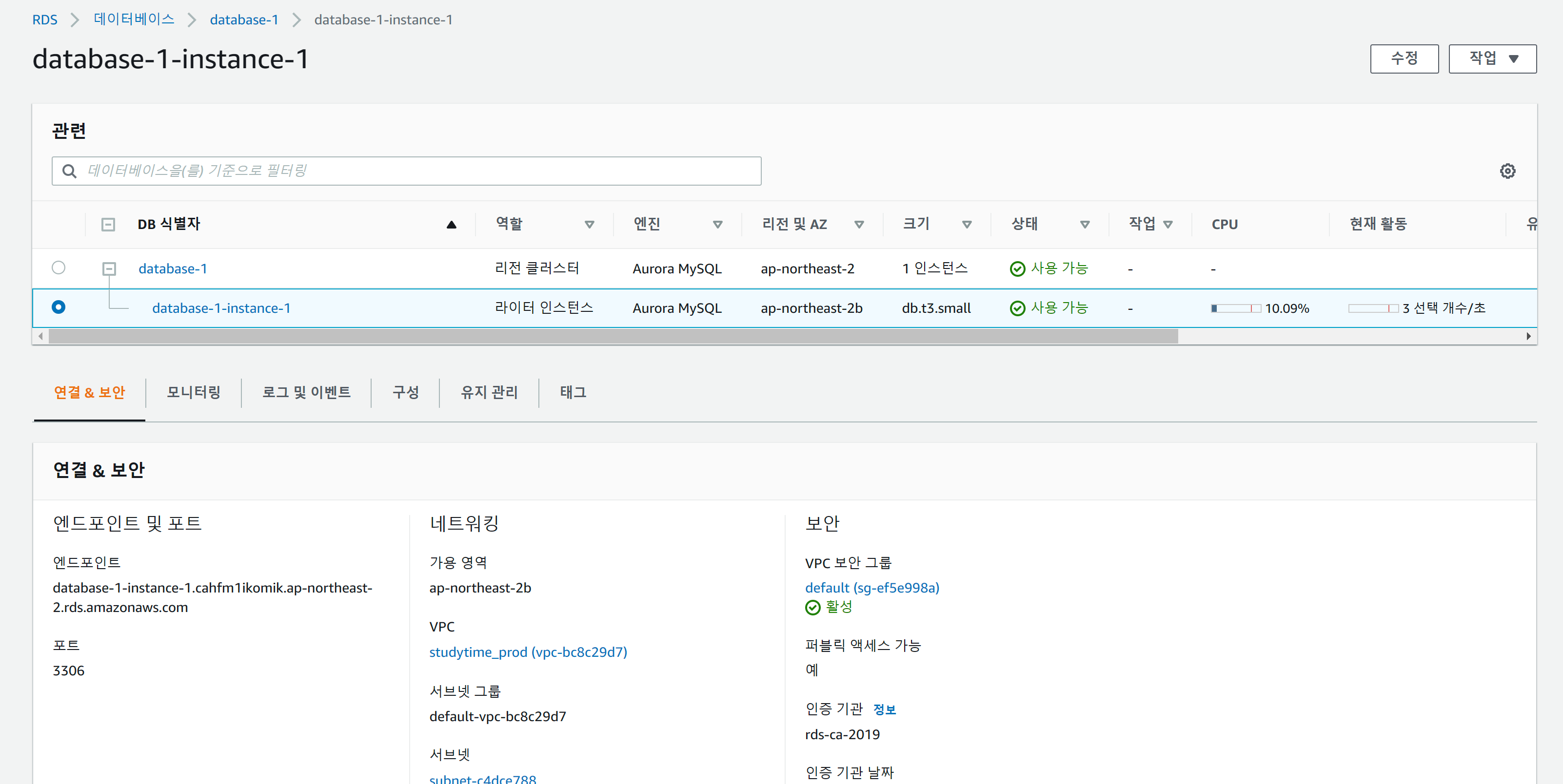 생성되는 동안 방화벽 작업을 해둡니다. 위처럼 DB가 생기는데 2개가 생기는 것처럼 보이지만 위에는 클러스터(그룹)라서 그냥 그루핑 해주는 놈입니다. 아래 라이터 인스턴스라고 쓰여있는 놈이 진짜 DB인데, 애를 선택해서 보안그룹을 눌러줍니다.