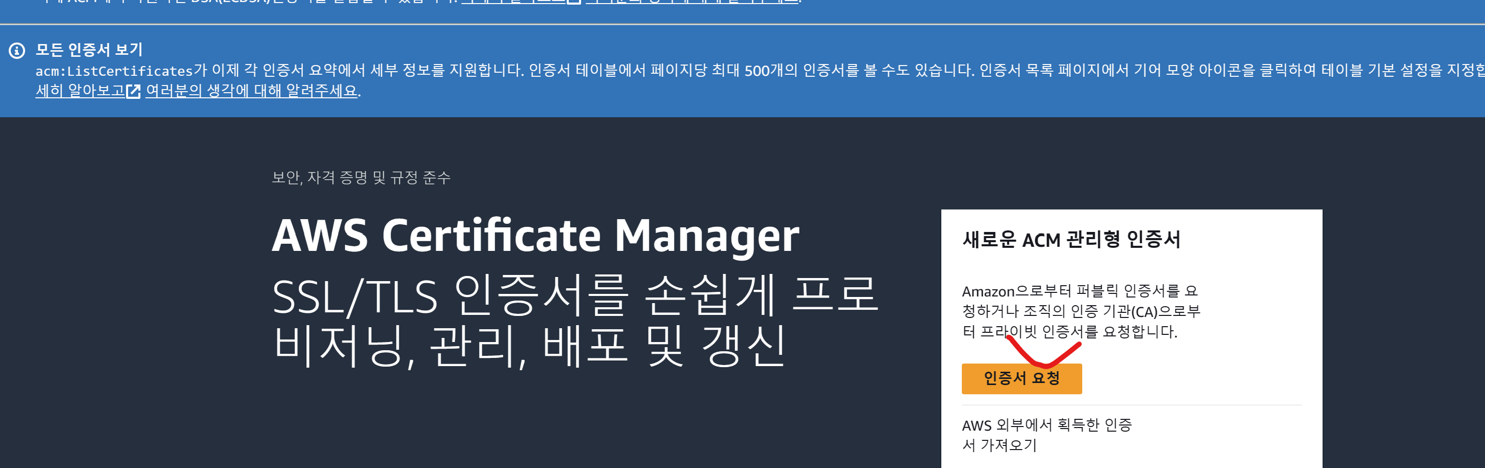 AWS에 인증서 서비스는 바로 ACM입니다. AWS Certificate Manager의 약자인데요, 아래 파란색으로 쓰여있는 Request new ACM certificate를 누르면 인증서를 발급할 수 있습니다.
