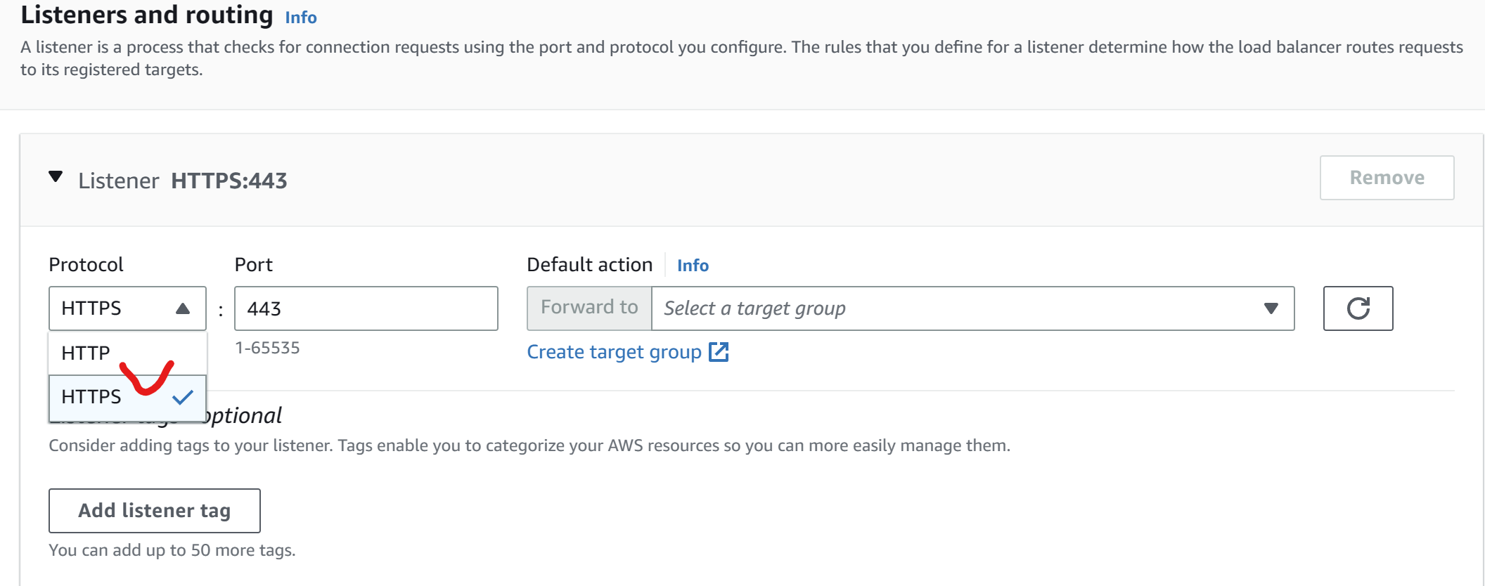 그 아래 보안그룹(security group)은 디폴트로 설정하고, 제일 중요한 Listeners and routing 박스를 봅시다. 여기에서 프로토콜을 선택할 수 있는데, 우리는 ssl을 사용하기 때문에 https를 선택해 줍니다. 그럼 포트번호가 443으로 변경됩니다. 옆에는 타겟 그룹(target group)을 정하라는 창이 있는데 타겟 그룹이란 ALB가 바라보는 ec2 그룹입니다.