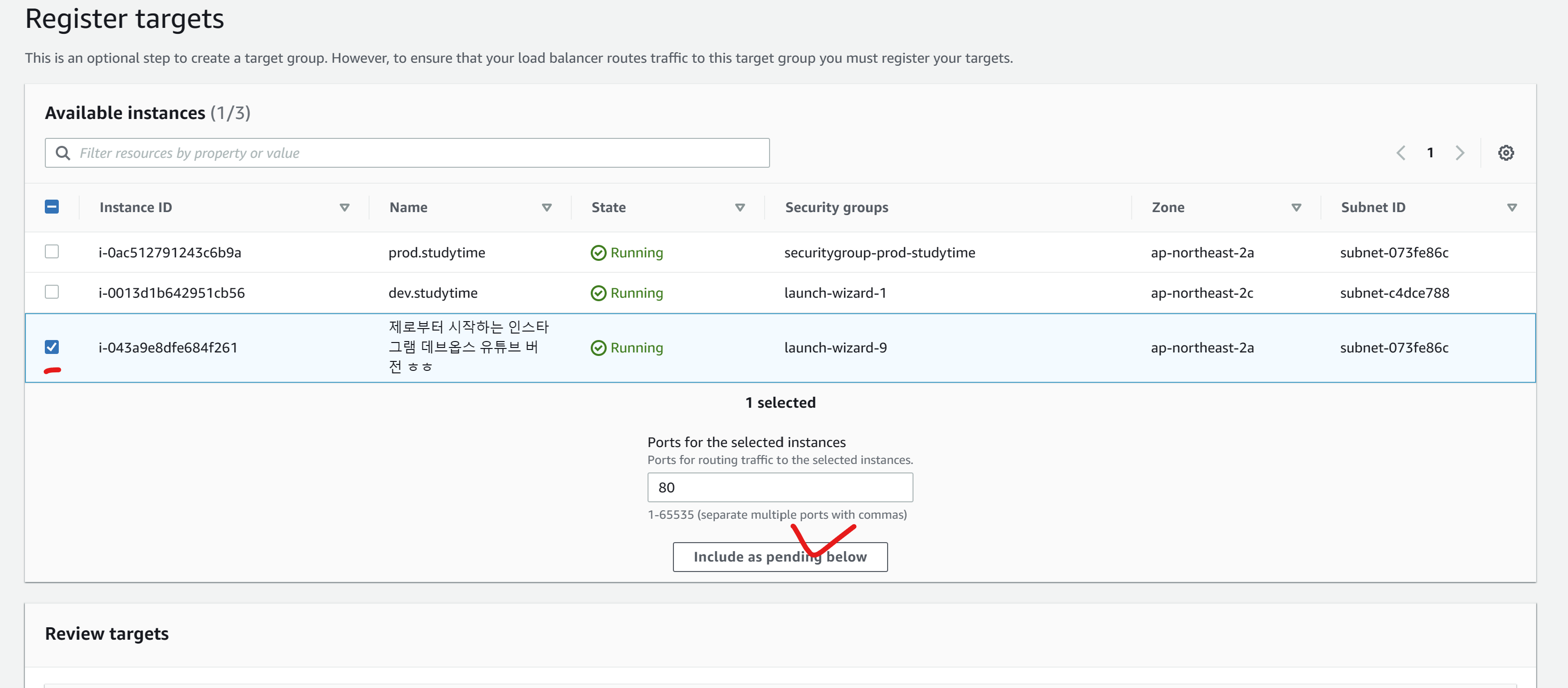 Include as pending below 버튼을 누르면 선택한 ec2가 아래 Review targets로 내려갑니다. 이제 해당 EC2는 타겟 그룹 소속입니다. ㅎㅎ create target group을 눌러서 생성을 마무리합니다.