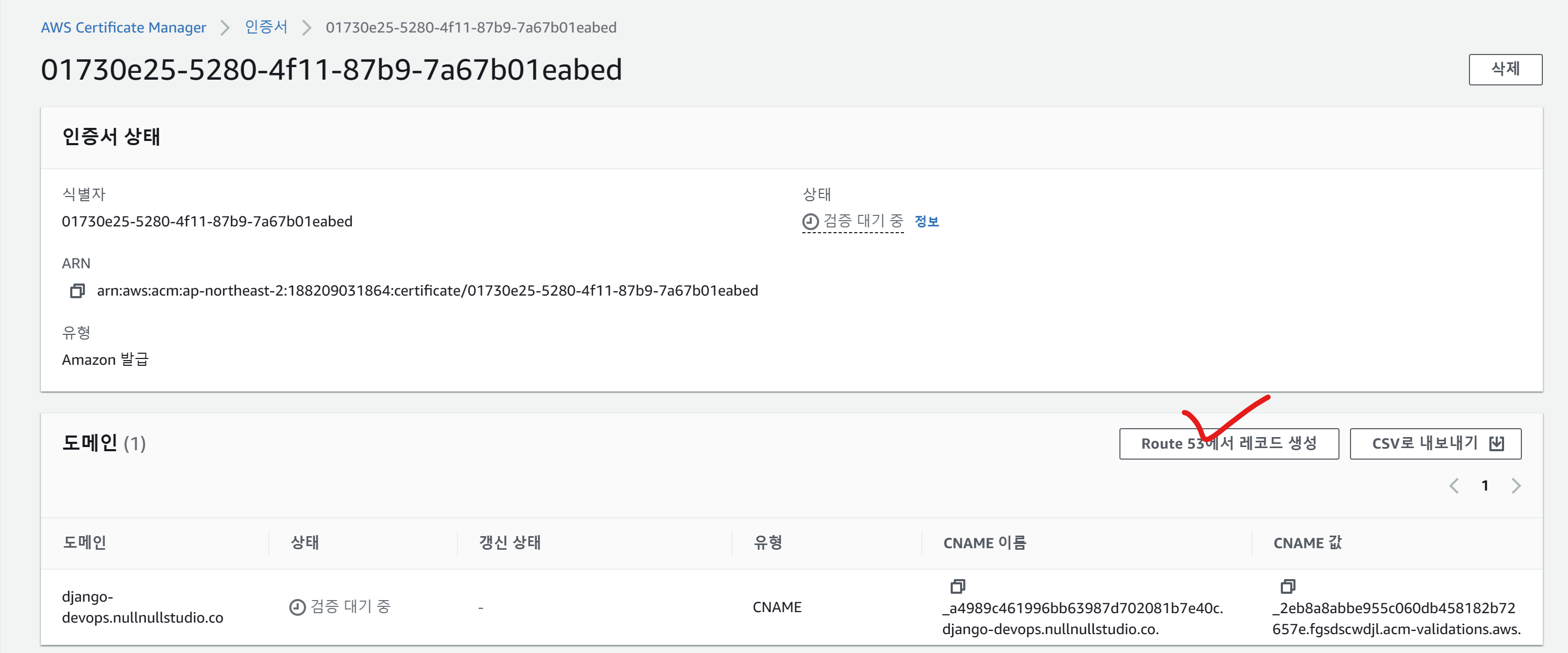 새로고침을 하면 새로운 인증서가 생성되었는데 아직 부적격입니다. DNS를 이용한 검증을 해야 하기 때문입니다. 인증서 ID를 눌러서 들어가면 상세 정보가 나오는데 여기서 Route 53에서 레코드 생성을 누릅니다.