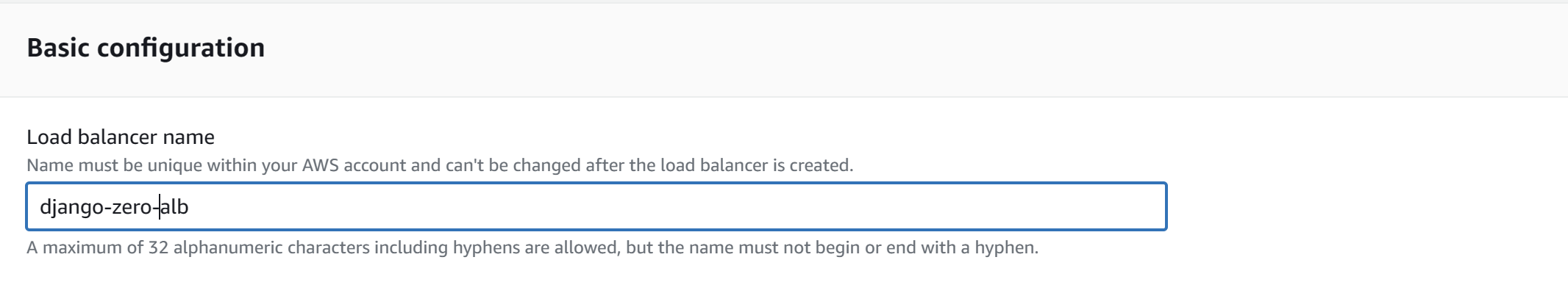 그럼 이제 상세 설정화면이 나오는데요, 일단 Load Balancer name을 정합니다. 저희는 django_zero_alb라고 할게요.
