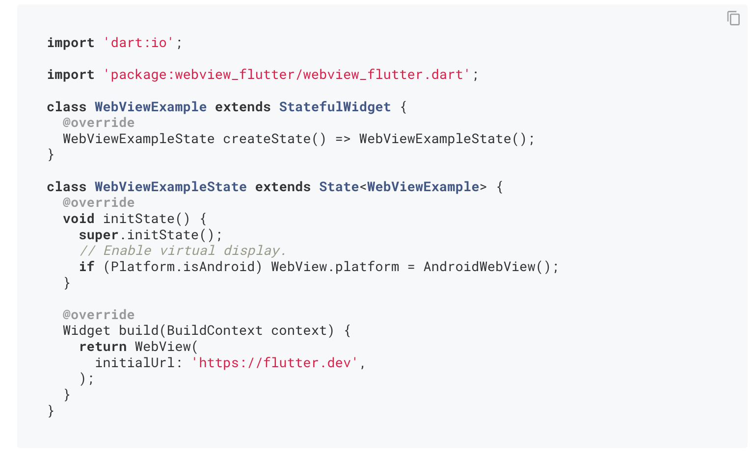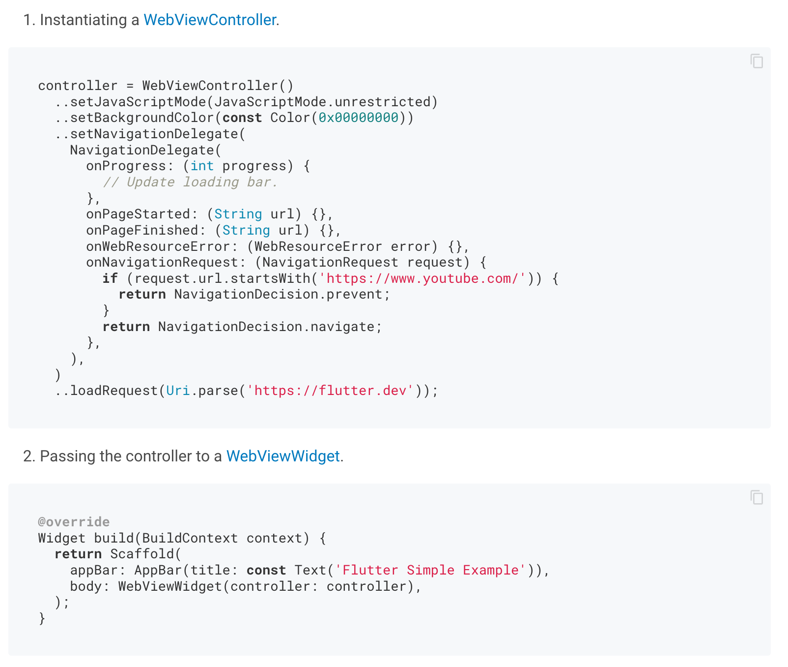 코드팩토리의 플러터 프로그래밍책을 보다가 webview_flutter package를 이용하는 게 있는데, 책에서 사용한 3.04와 현재 최신인 4.xx버전이 사용방법이 많이 달라진 것 같다. 이런 패키지가 버전이 달라진다고 사용방법이 자주 바뀌지는 않는데, 아무래도 메이저 버전이 업데이트되었으니 변경된 것 같다. 아니면 네이티브 진영(안드나 아이폰)에서 뭔가 설정이 바뀌어서 업데이트가 됐나?