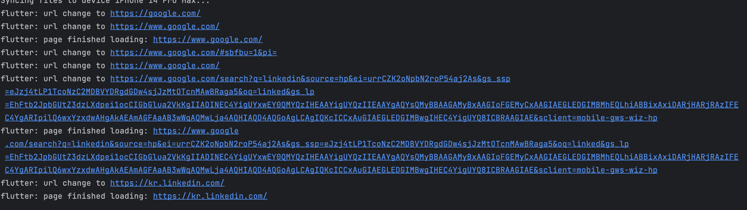 실제로 막 눌러보니 대부분의 페이지는 잘 안들어가지는데 (ssl이슈인가 에뮬레이터 이슈인가..) 구글이나 링크드인은 접속이 된다. 이동할 때마다 아래와 같이 로그가 찍힌다.