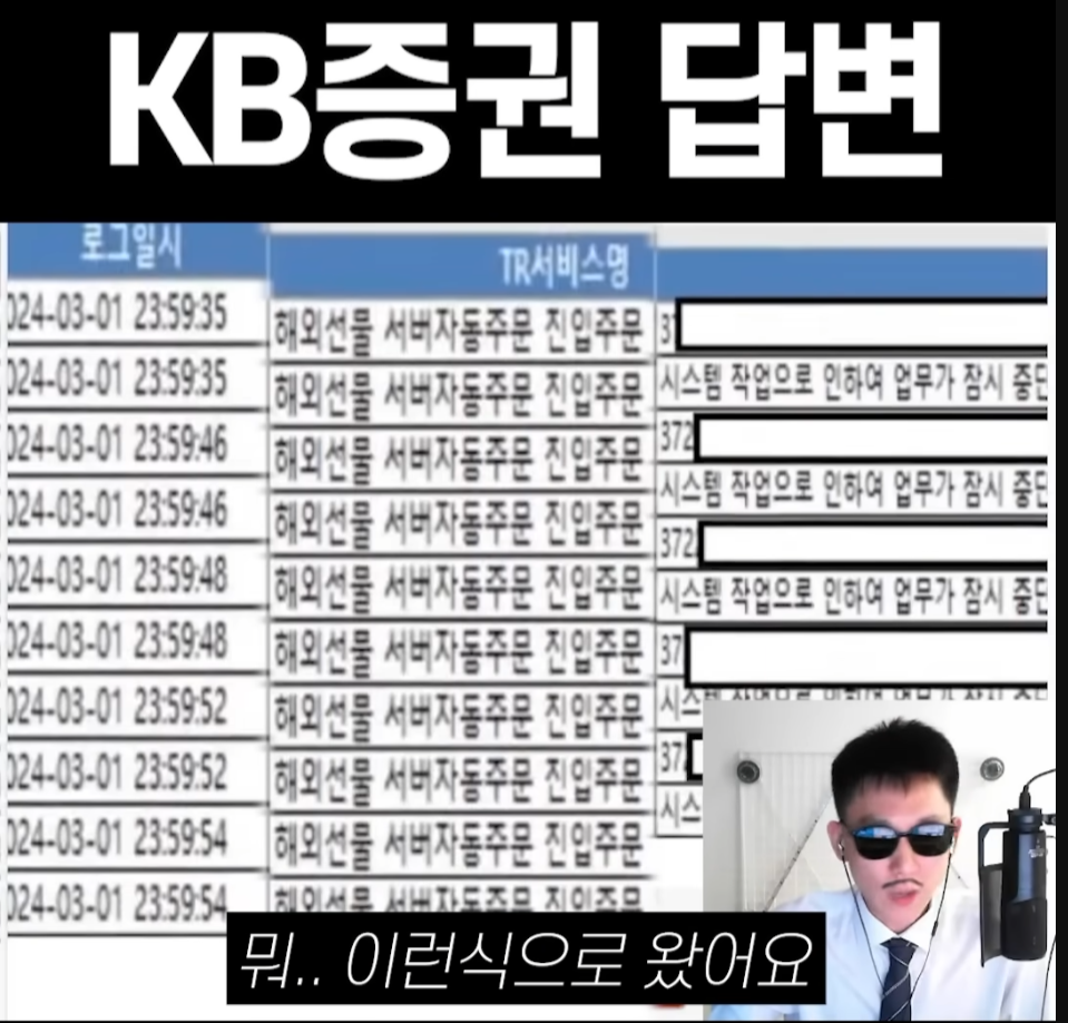 유튜브 알고리즘에 의해 어쩌다가 인범 TV 쇼츠가 떴는데, 내용이 KB증권 고소한다는 내용이었다. 무슨 내용인가 영상을 시청했는데, 3월 1일 23시 59분경에 해외선물 주문을 냈는데 '시스템 작업으로 인하여 업무가 잠시 중단되고 있습니다.' 에러가 발생한 것이다. 그 에러를 딱 봤을 때, "와 개발자 X 됐다.."라고 생각이 들었다. ㅋㅋㅋ
