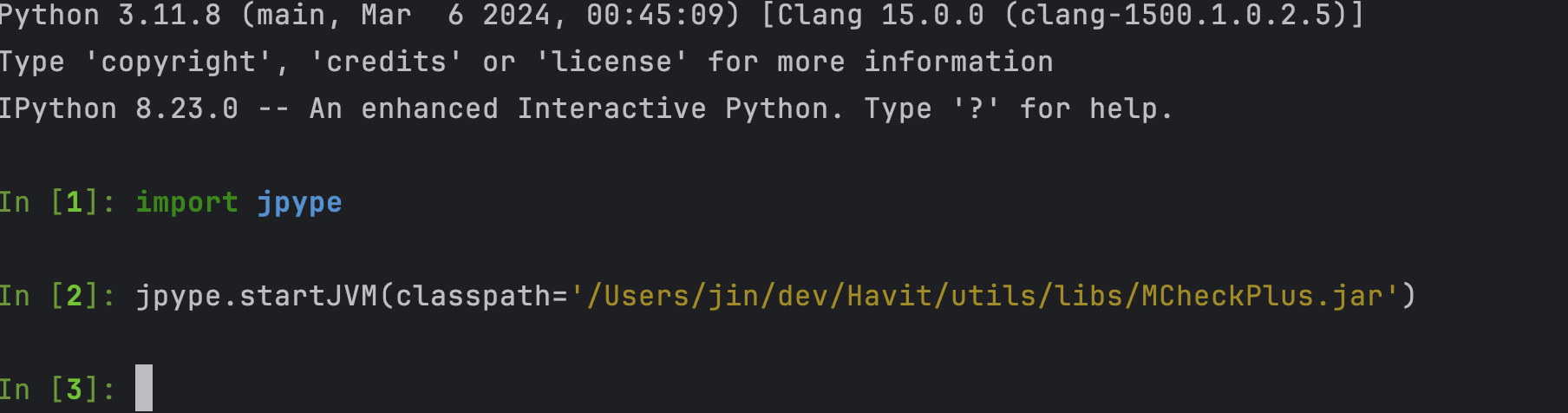 jpype를 이용해 jvm을 시작하기 위해선 jpype.startJVM(classpath={.jar 경로})를 입력하면 된다.