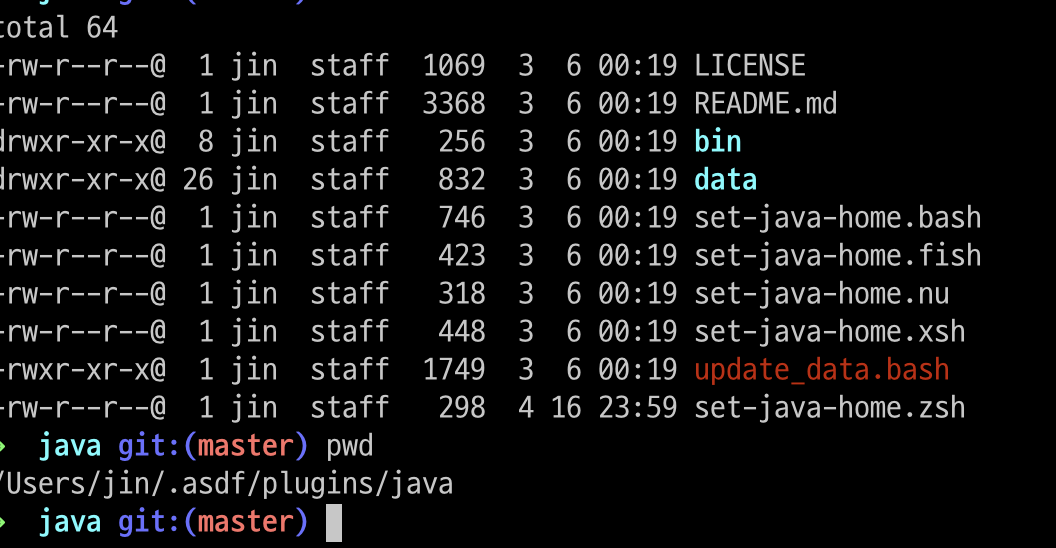 홈 경로에서 ~/.asdf/plugins/java에 가보면 set-java-home이라는 쉘들이 많은데, 여기서 컴퓨터에 설치된 쉘을 실행해 주면 된다.