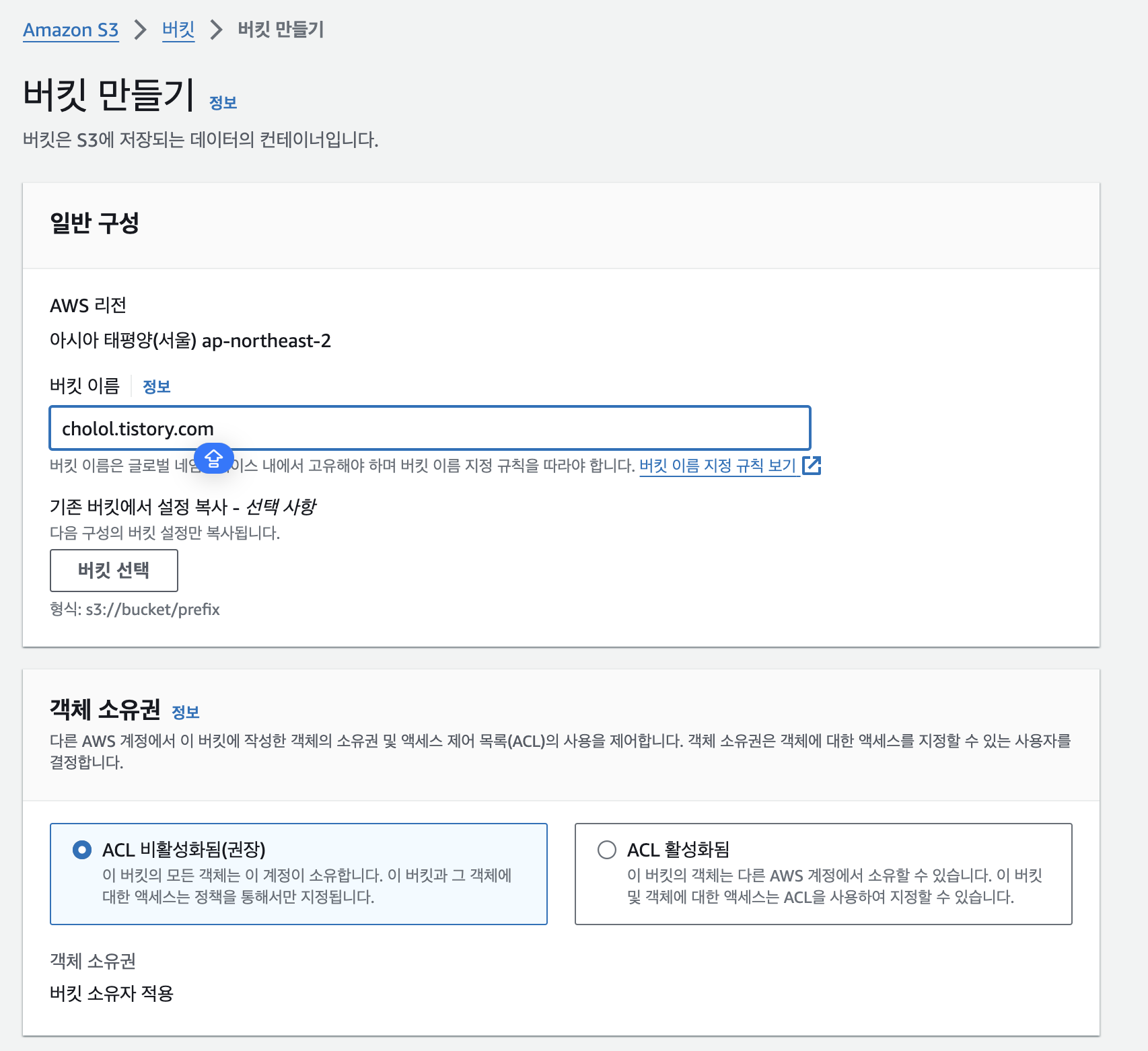 버킷의 이름을 정하고 객체 소유권은 권장 설정을 사용한다.
