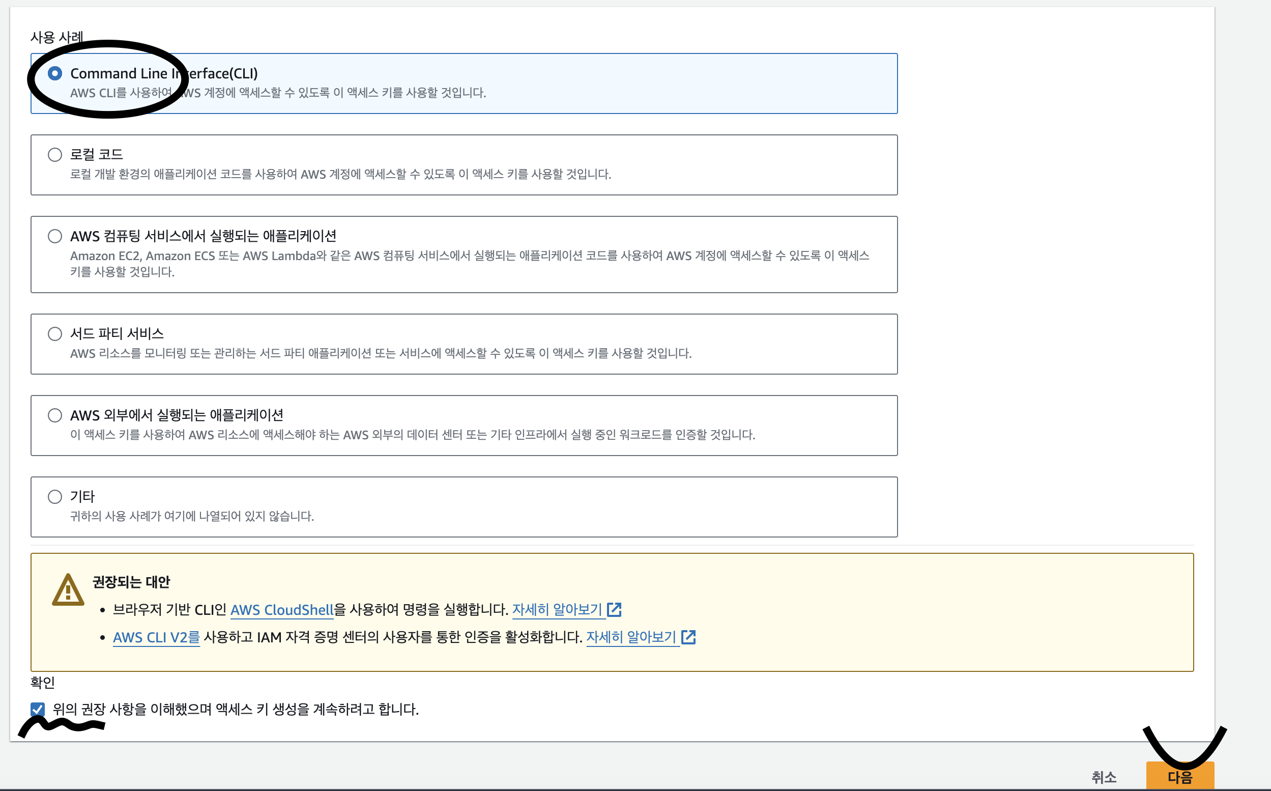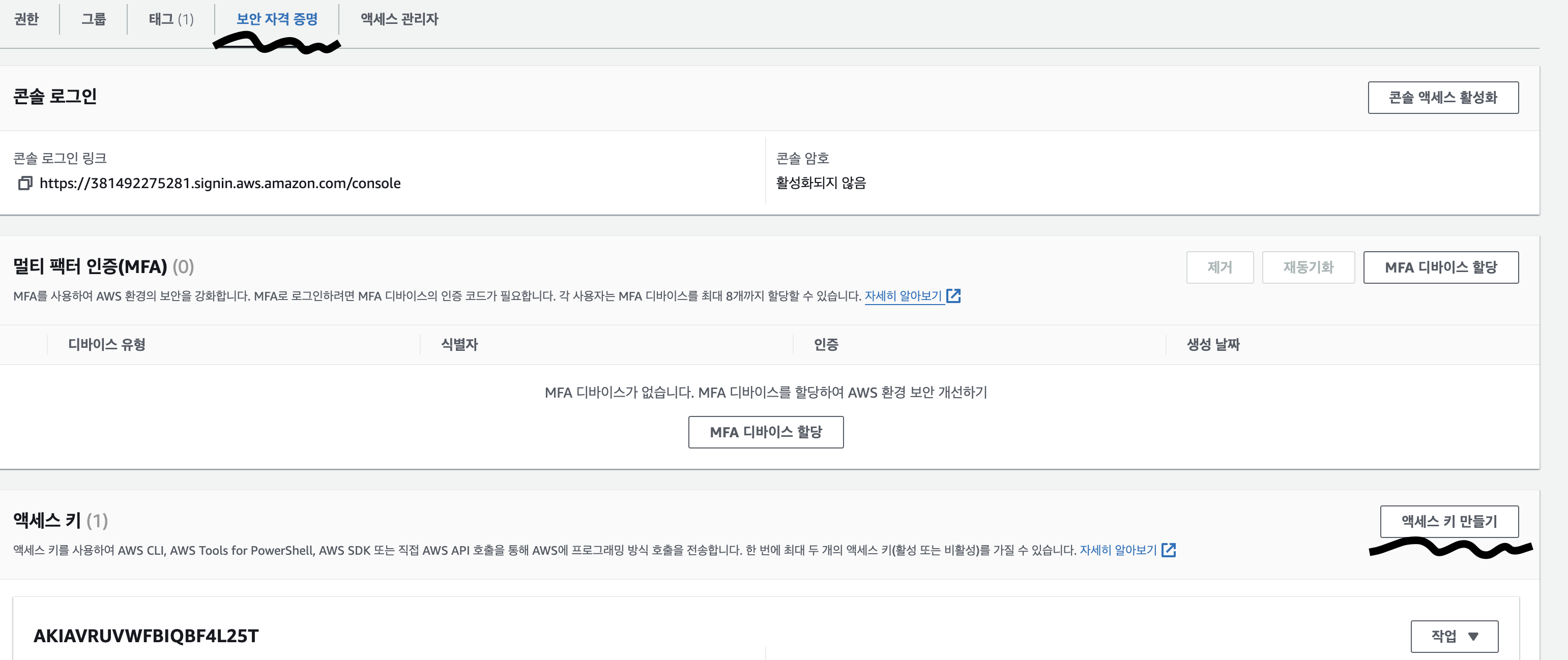 사용자 상세 정보로 들어가서 궈보안 자격 증명을 누른 후 아래로 내려가면 액세스 키라는 메뉴가 있다. 여기서 액세스 키 만들기를 누르면 Access_key와 Secret_key를 만들어준다.