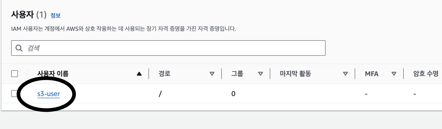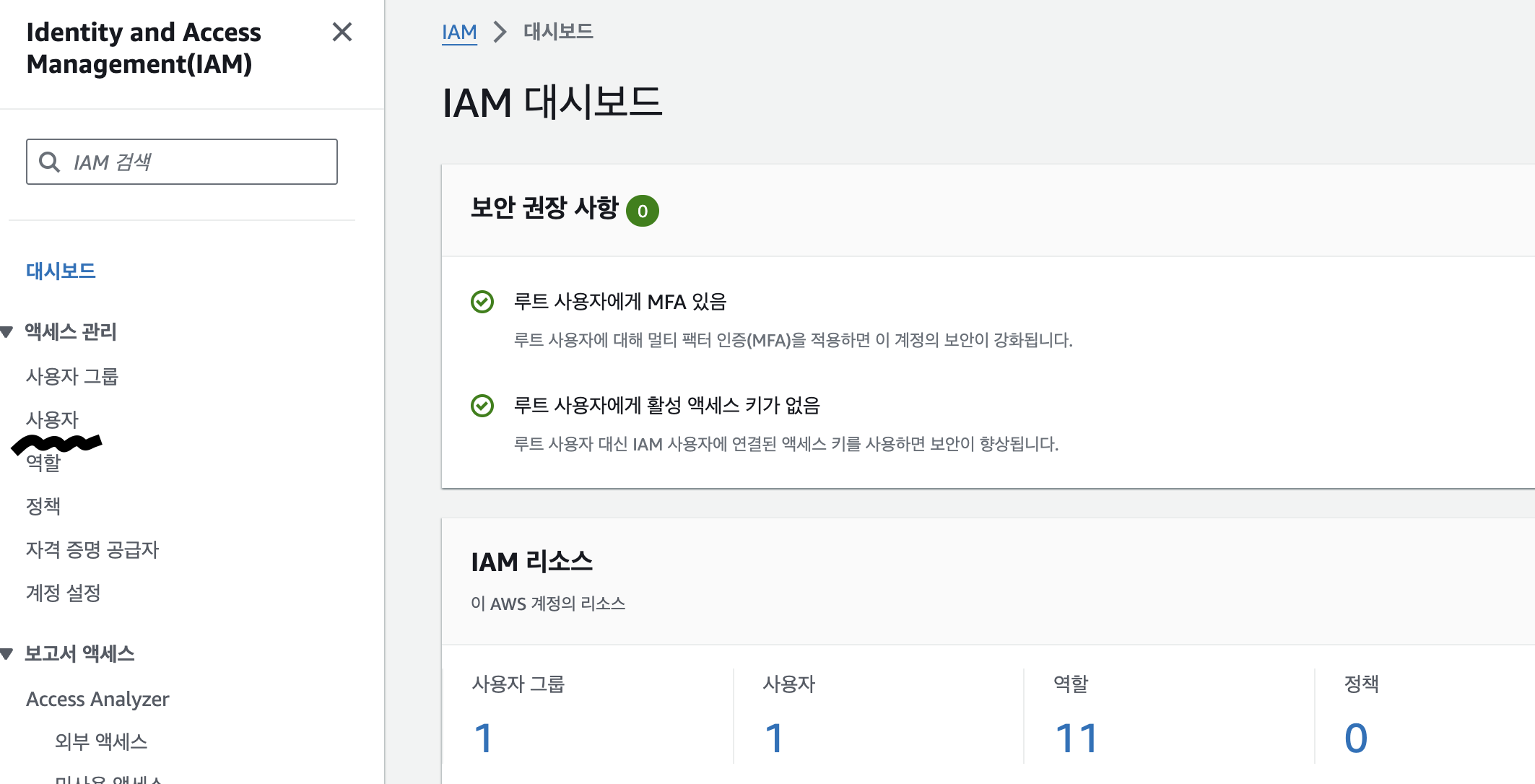 키를 만들기 위해서 AWS 콘솔에서 IAM메뉴로 들어간다.