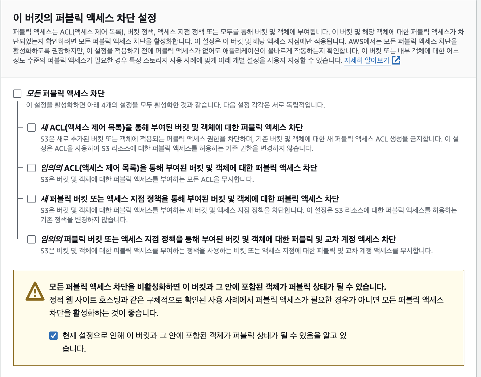 중요한건 아래 있는 모든 퍼블릭 액세스 차단이다. 디폴트로 이게 켜져 있는데, 퍼블릭 차단이 켜져 있으면 외부에서 s3접근이 안된다. 즉 이미지를 올려도 사용자가 볼 수 없다는 뜻이다.