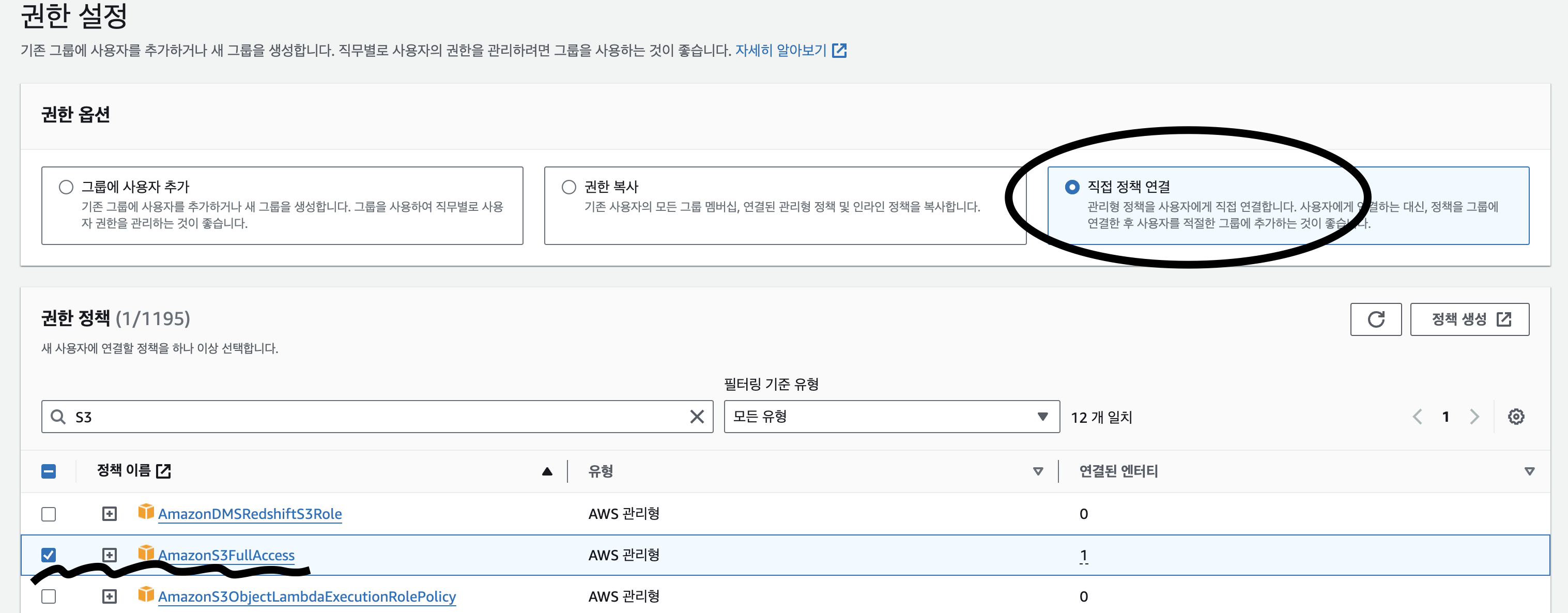 이름을 대충 정하고 다음을 누르면 권한 설정이 나오는데, 직접 정책 연결을 누른 후 S3 FullAccess를 선택해 준다. 여기서 선택하는 권한이 이 사용자가 할 수 있는 권한이다. 우리는 S3접근이 필요한 사용자가 필요하기 때문에 이거만 선택!