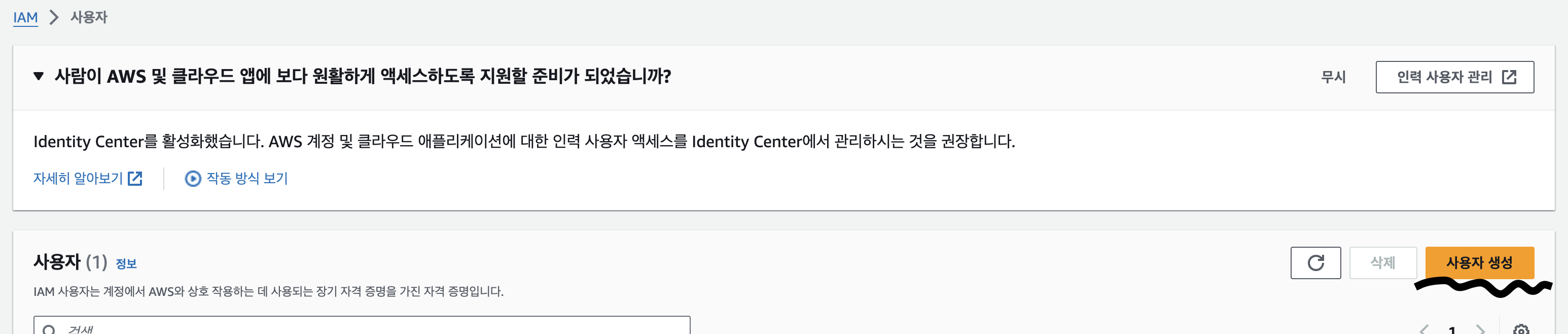 다음을 누르고 사용자 생성을 누르면 사용자가 만들어진다.