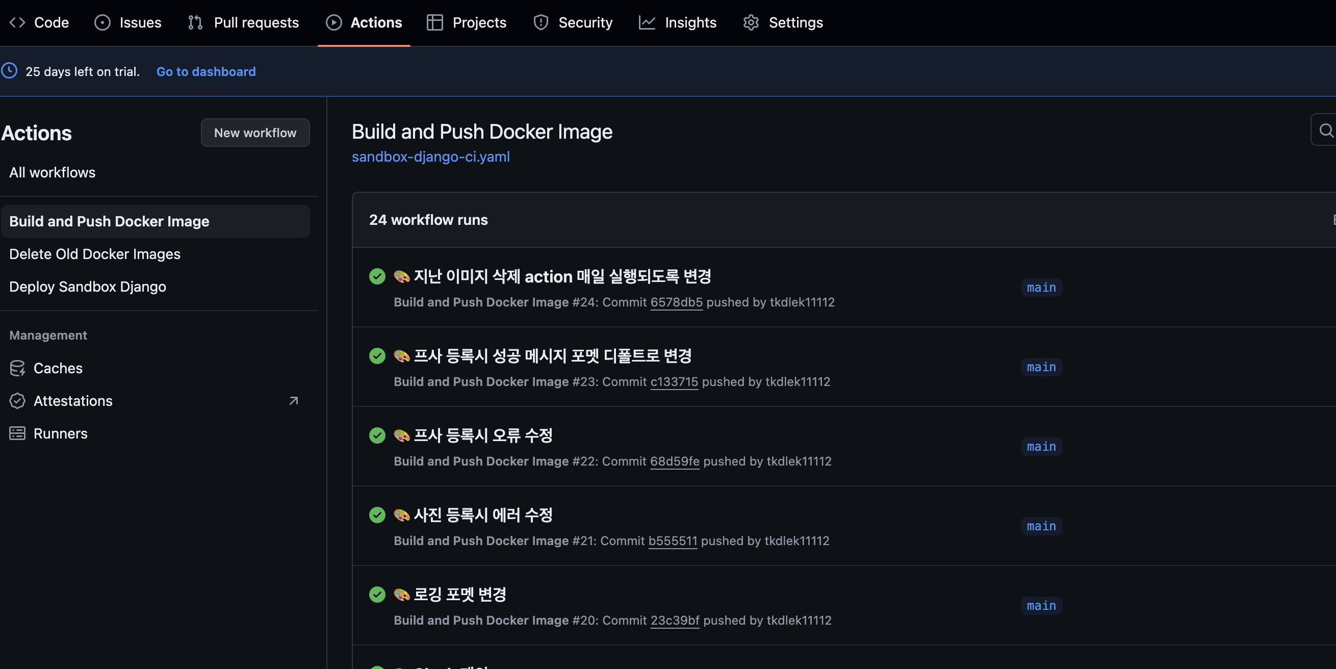 실제로 위 yaml을 추가하고 main push 하면 자동으로 github repo 페이지 action메뉴에서 job이 실행되는 것을 확인할 수 있다.