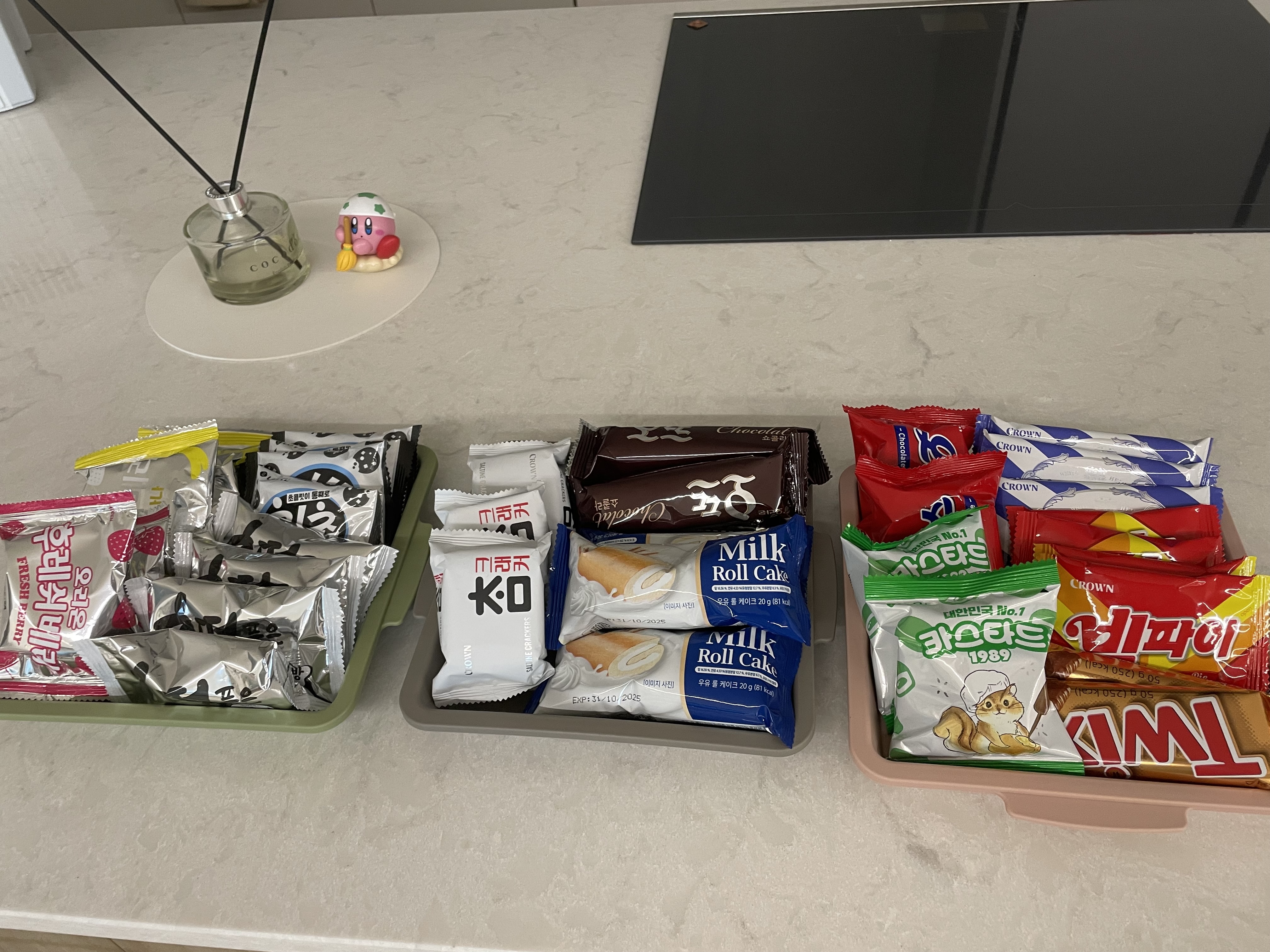 과자는 어떤 걸 좋아하는지 몰라서 여러 개를 꺼내놓았는데, 대부분 남아서 내가 다 먹을 예정 ^오^