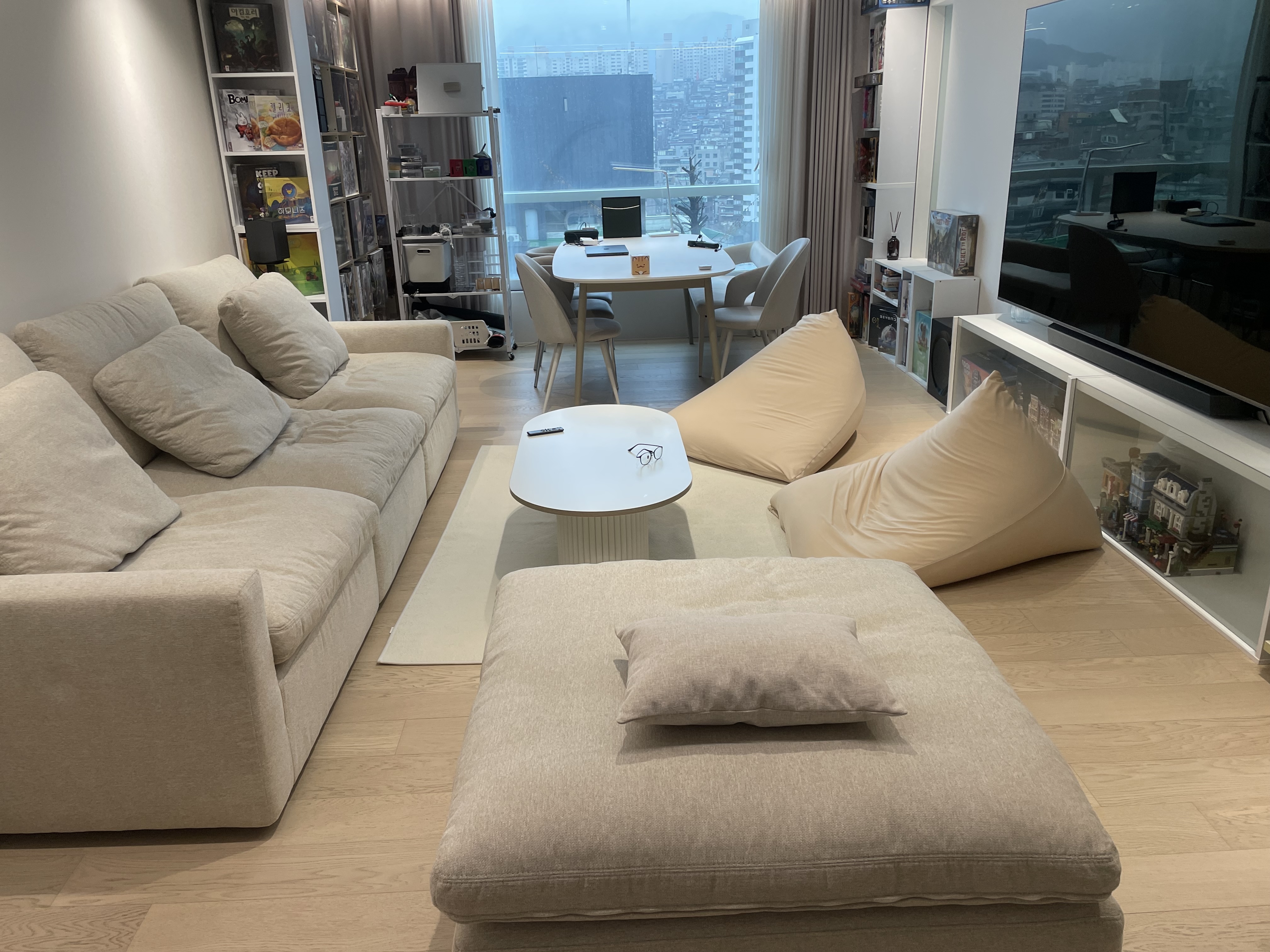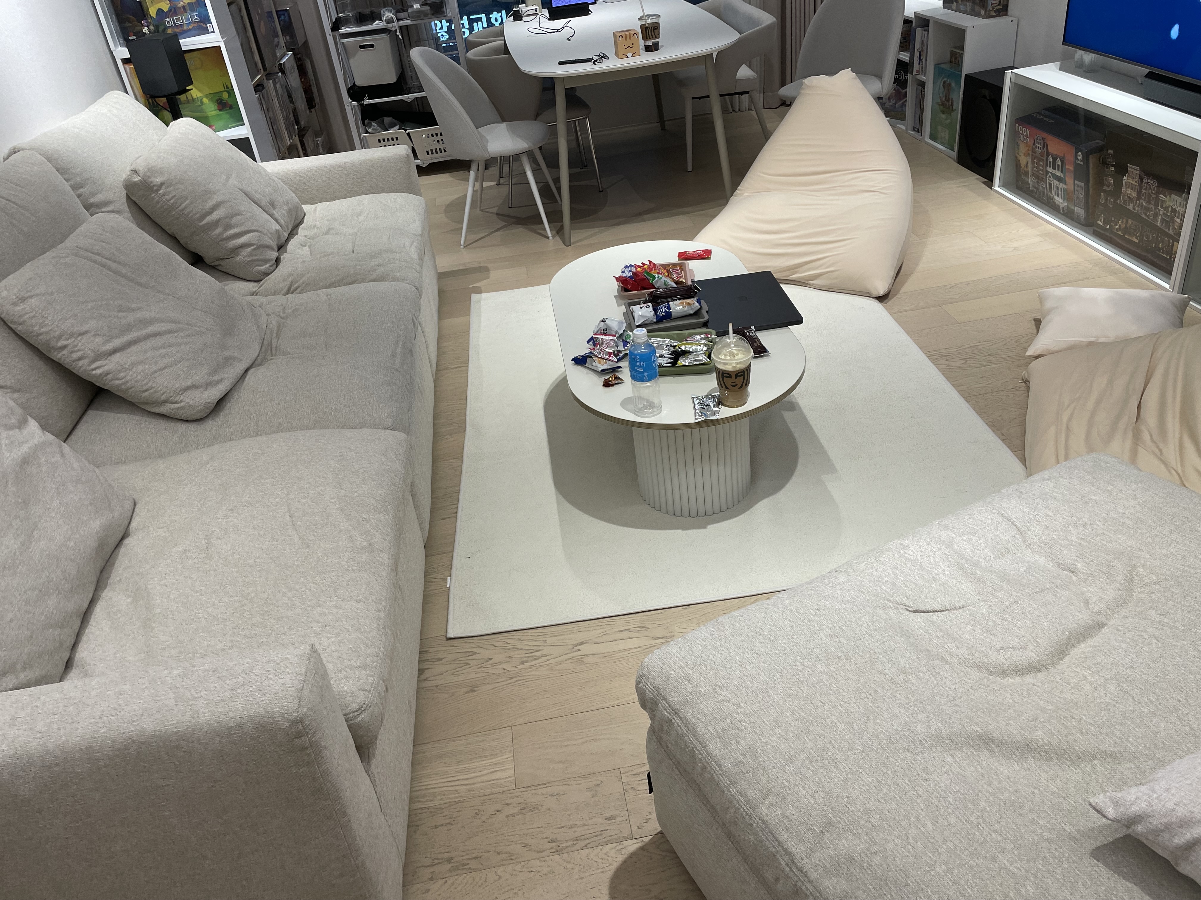 그래서 방구석에 있던 빈백을 꺼내서 소파 반대편에 놓고, 쇼파 자리에 편하게 앉을 수 있도록 쇼파 위치를 조금 수정했다.