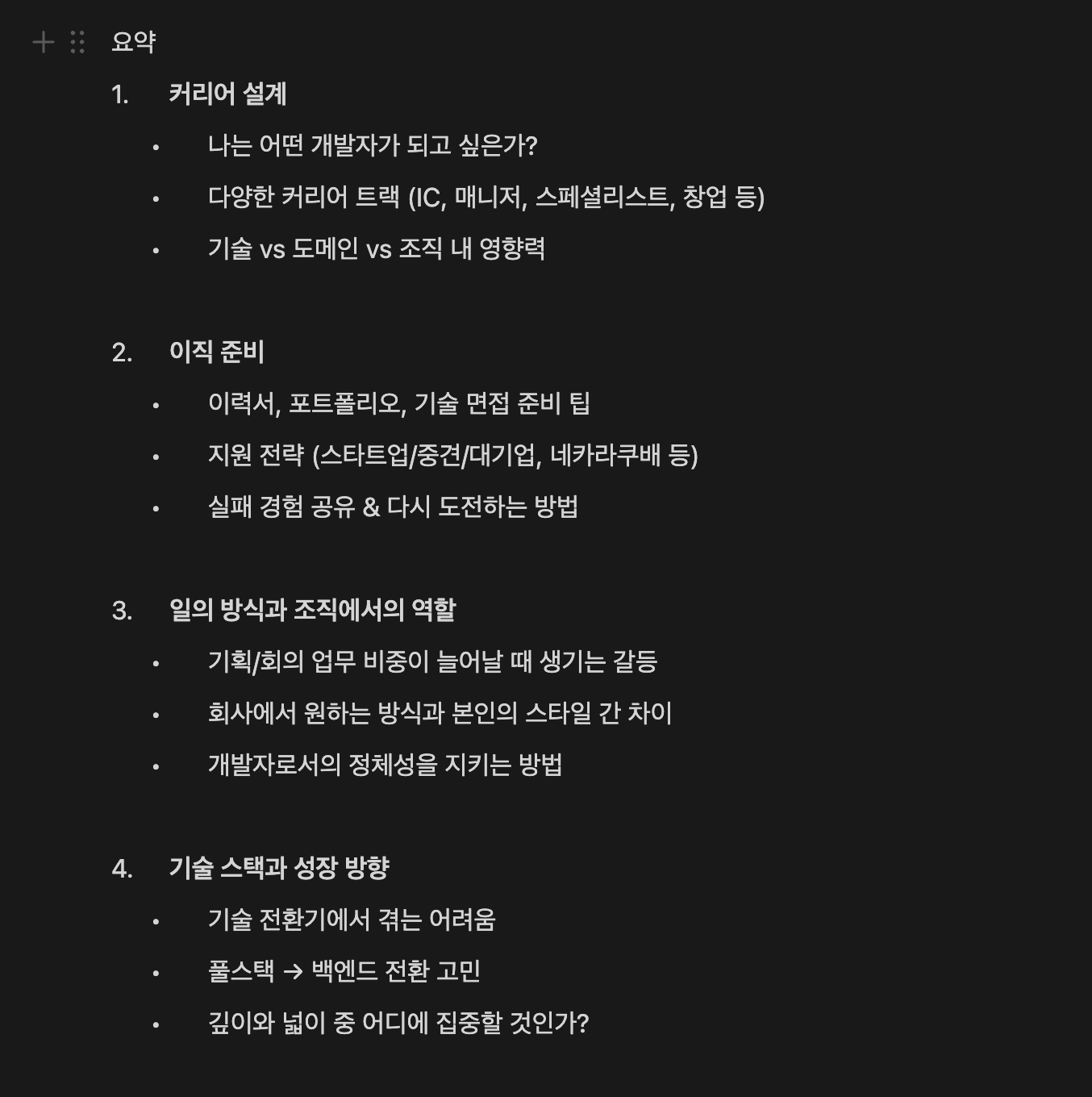 참여자분들도 대부분 이런 고민을 하고 있었지만, 아직은 그런 선택을 받게 되는 연차는 아니었다. 대부분 어떻게 하면 더 개발을 잘할까의 고민을 하고 있는 것 같았다. 스스로 생각하기에 내 성장을 막고 있는 문제점을 말하셨는데, 대부분 조직이나 팀 얘기가 많았다.